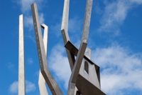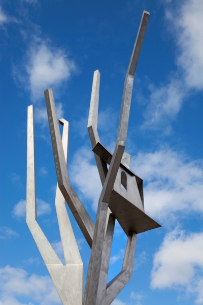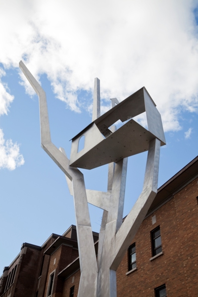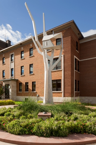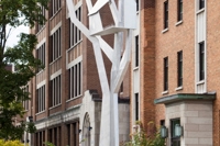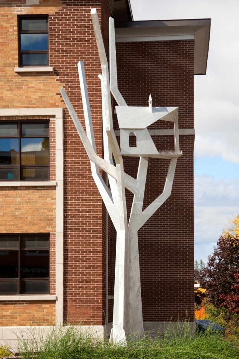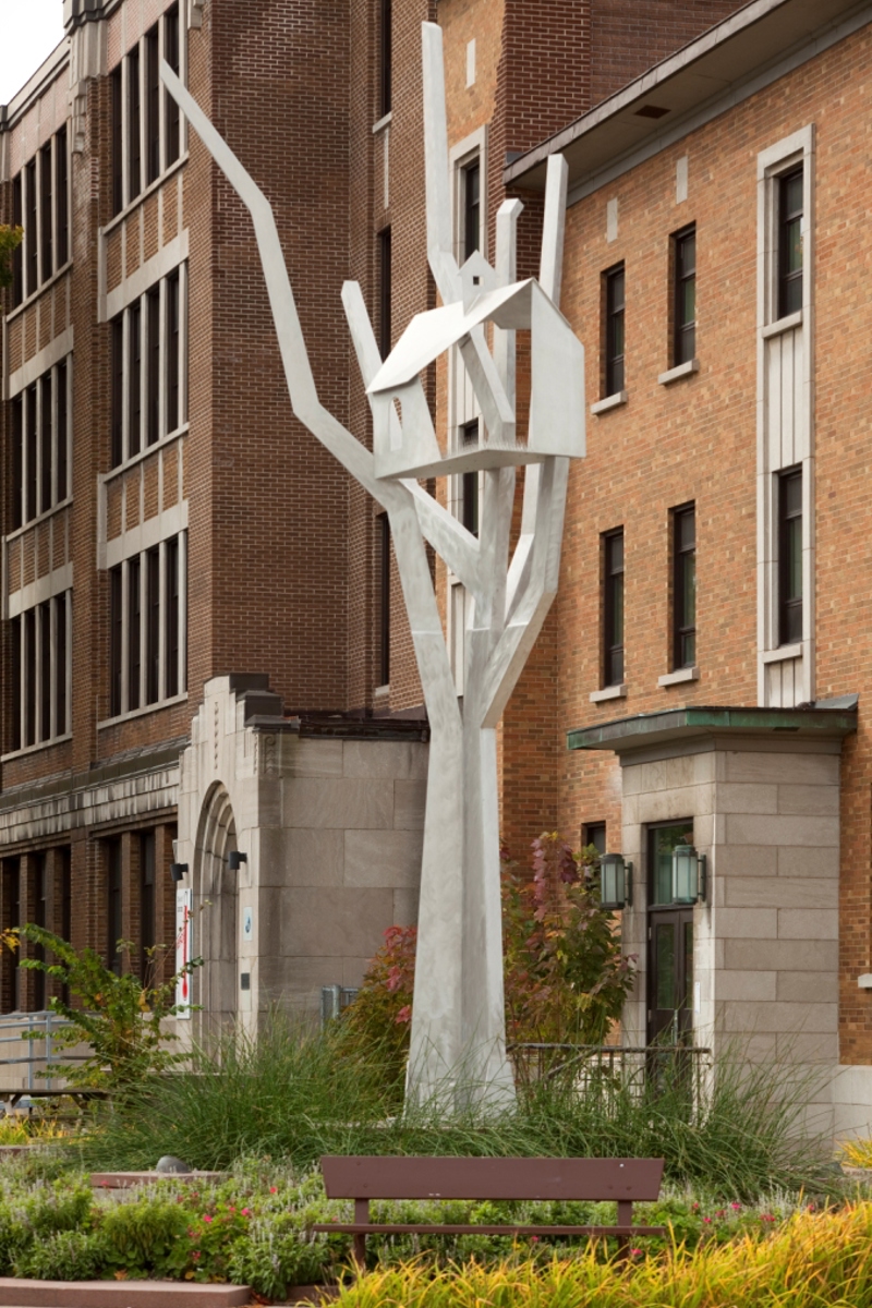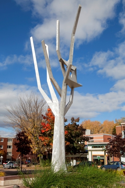 Marguerite Bourgeoys, arrivée en Nouvelle-France en 1653, est la première institutrice de la colonie et la fondatrice de la congrégation de Notre-Dame. La sculpture qui lui est dédiée prend la forme d’un arbre qui abrite une école, figurant à la fois l’enracinement dans le milieu et l’épanouissement par l’apprentissage.