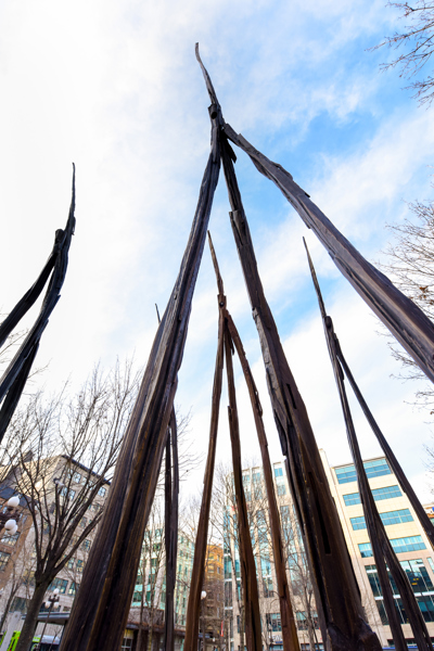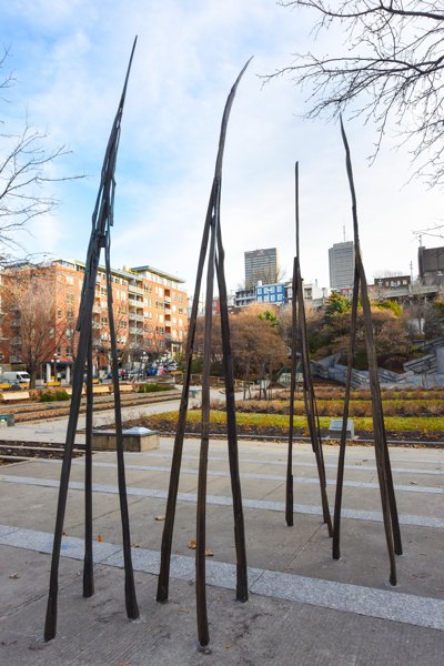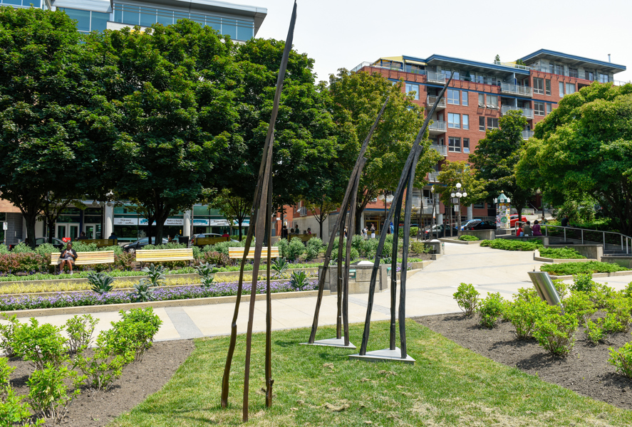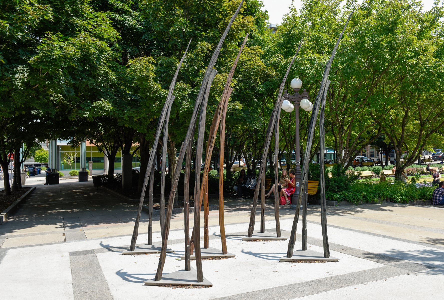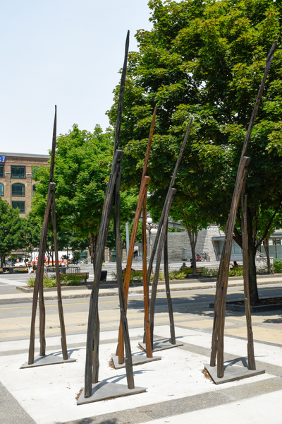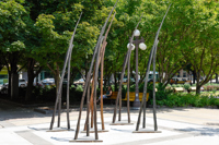 Les Attracteurs forment un ensemble de 36 sculptures, étranges créatures à la silhouette gracile, toutes uniques. Regroupées par trois ou par cinq, près de la moitié sont interactives. En les approchant, on pourra les voir « s’allumer » et murmurer des sons insolites, comme venus du sol même.