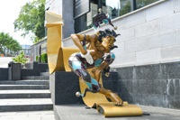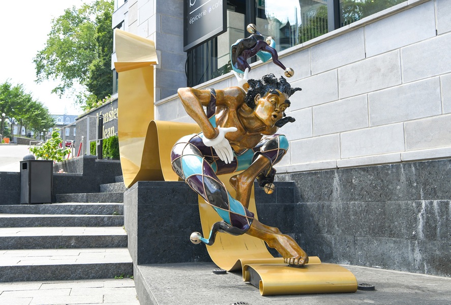 Sous les traits d’un fou du roi, le personnage en bronze exécute une ample révérence comme pour souhaiter la bienvenue à son souverain et saluer en même temps les passants. La sculpture est la version grandeur nature d’une œuvre de plus petite dimension. Auparavant située sur la rue des Jardins, elle a été déplacée à son endroit actuel en 2019.