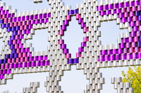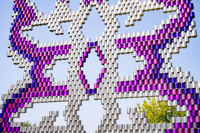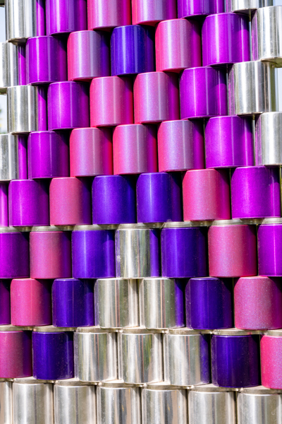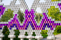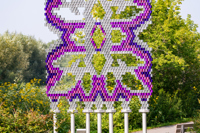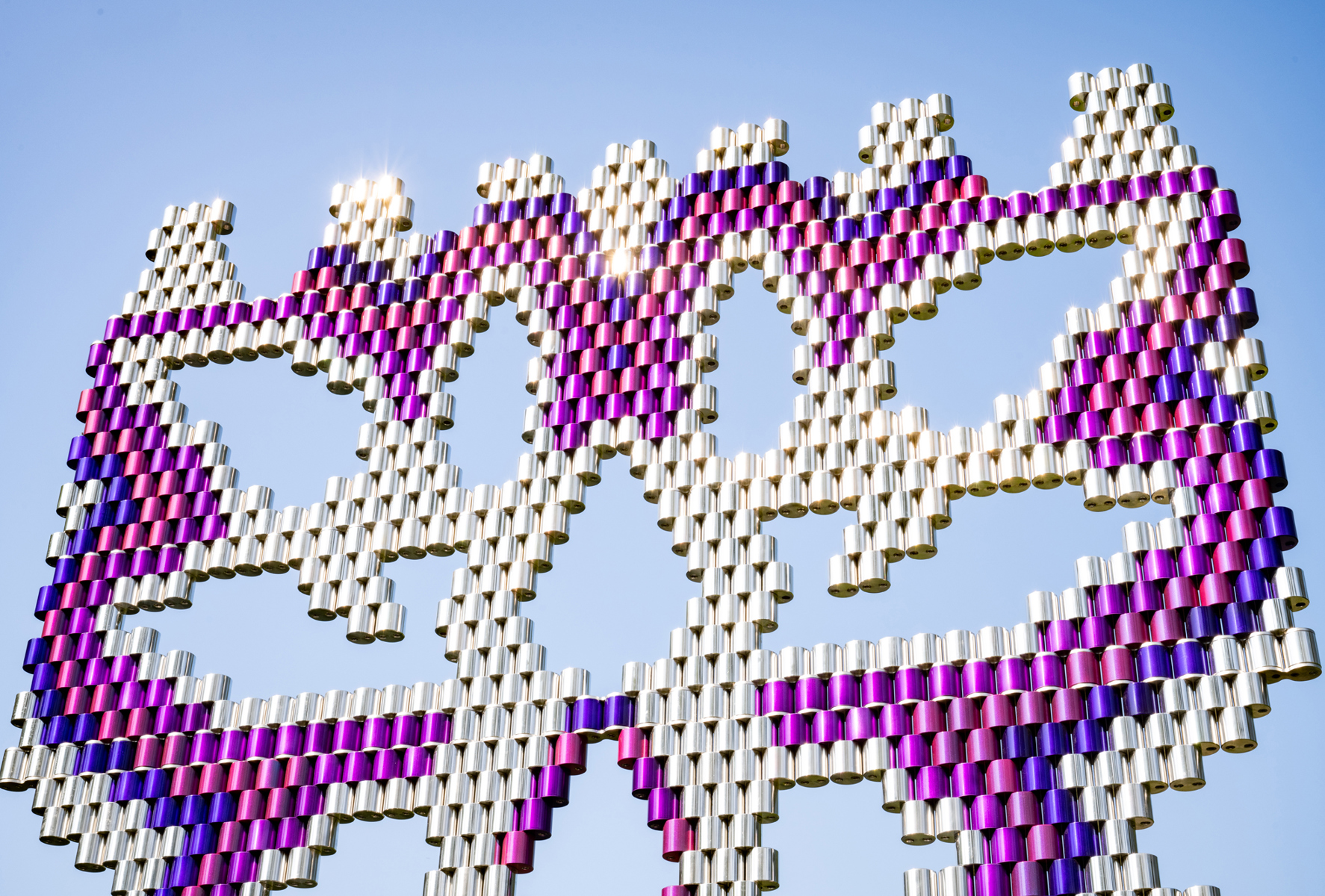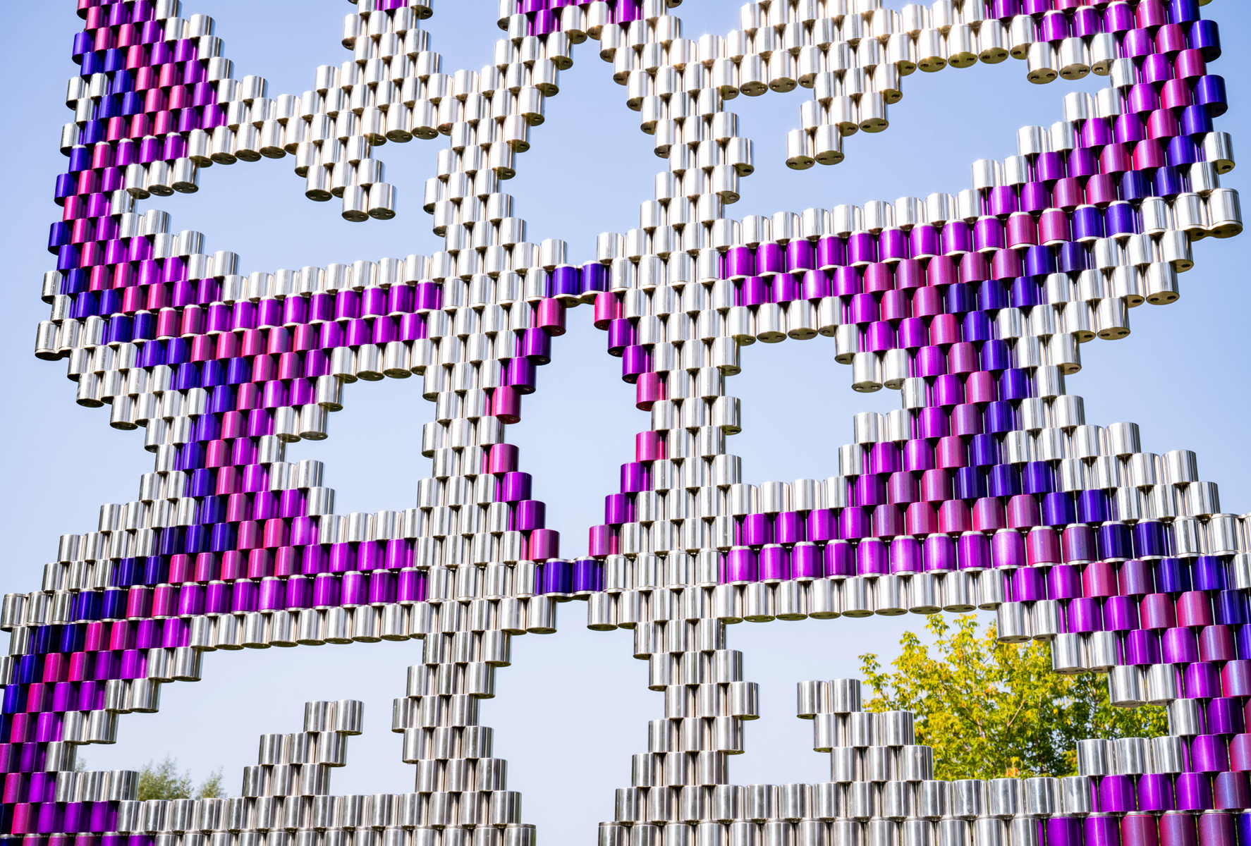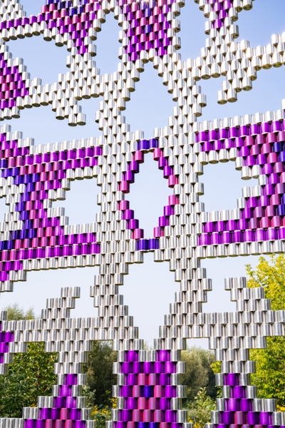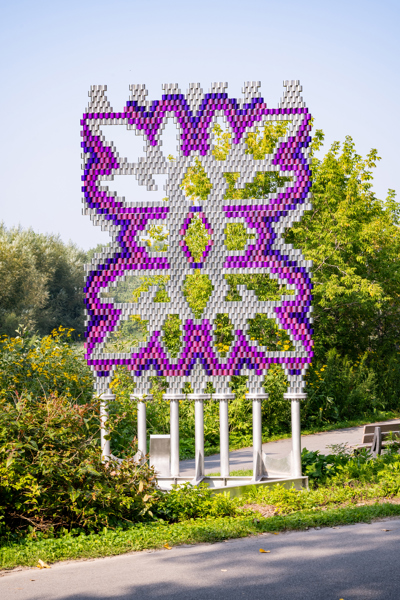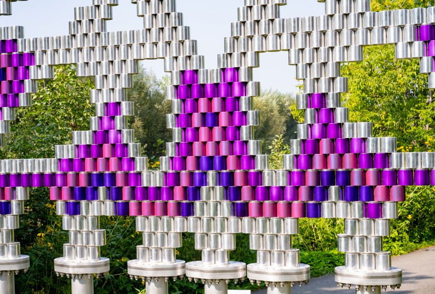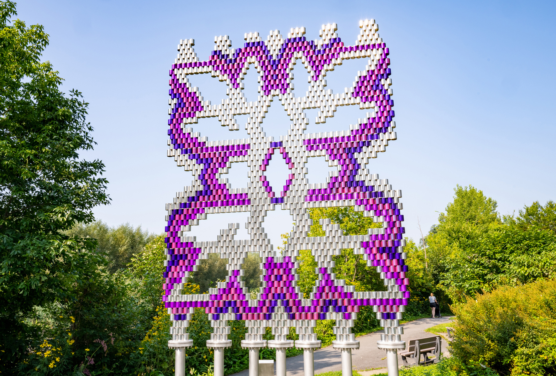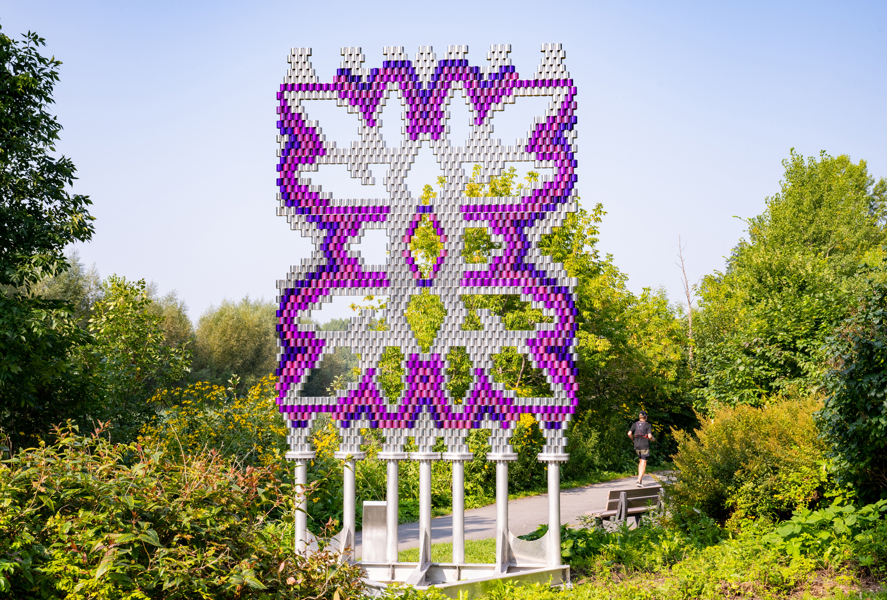 Quel délicat motif semble ici brodé dans le rideau de verdure ? Cette sculpture se compose de perles métalliques peintes en nuances de rose ou polies comme des miroirs. Sa silhouette géométrique figure une plante médicinale. Une dentelle qui encadre et reflète le paysage. De fait, cette œuvre contemporaine réinvente l’art autochtone du tissage de perles colorées. En agençant les pièces, elle symbolise les liens qui nous unissent aux objets et aux lieux. Elle métisse ainsi les époques et les cultures tout en célébrant la magie de la nature. Son titre signifie d’ailleurs « faire une offrande et rendre grâce » en langue anichinabée.