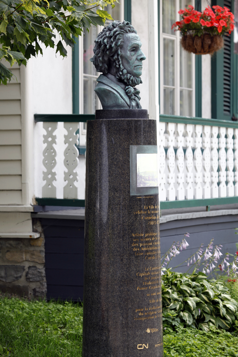 Le sculpteur charlevoisien Gérard Thériault (1939-2001) a signé ce buste en bronze de Cornelius Krieghoff (1815-1872). La sculpture qui lui rend hommage avoisine la maison qu’il a habitée quelque temps, au 115 de la Grande Allée Ouest. Le piédestal en granit est orné d’une reproduction du tableau Québec vu de la pointe de Levy, peint en 1853.