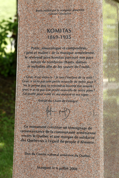 Komitas (1869-1935) est considéré comme le « père et le maître » de la musique arménienne. Il a parcouru les campagnes d’Arménie à la recherche de danses et de chansons populaires qu’il a fait connaître dans le monde. Incarnant l’esprit d’ouverture aux autres cultures, il constitue un symbole d’unification et sa musique est omniprésente chez les Arméniens du monde entier. Le piédestal comporte un extrait d’une chanson qu’il a écrite. Le buste est un don du Comité national arménien du Québec.