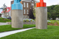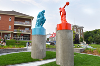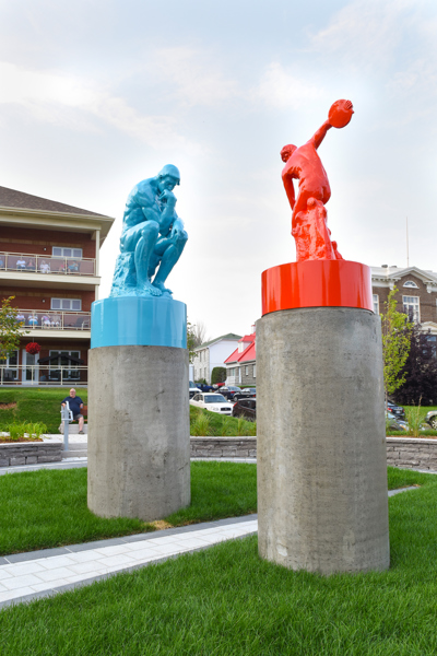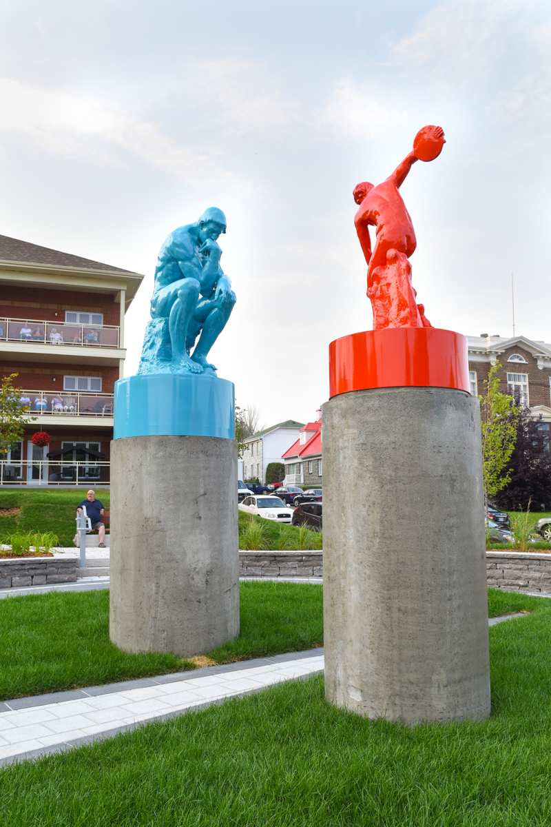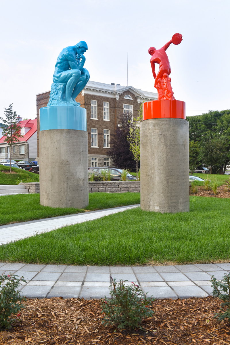 Cet ensemble sculptural met en relation deux œuvres emblématiques de l’histoire de l’art, Le penseur de Rodin et Le discobole de Myron. Les couleurs vibrantes et les socles de béton, tout comme la disposition dans l’espace, donnent aux sculptures une facture actuelle et accentuent en même temps leur pouvoir d’évocation.