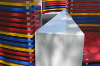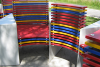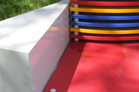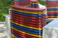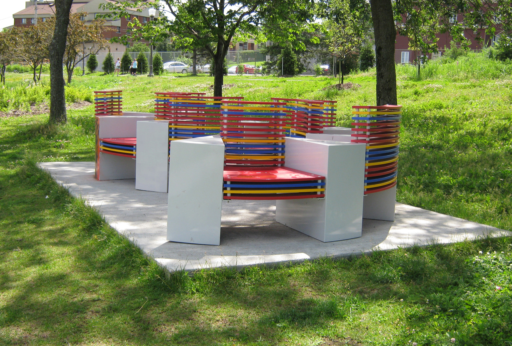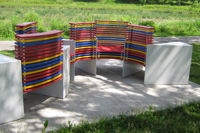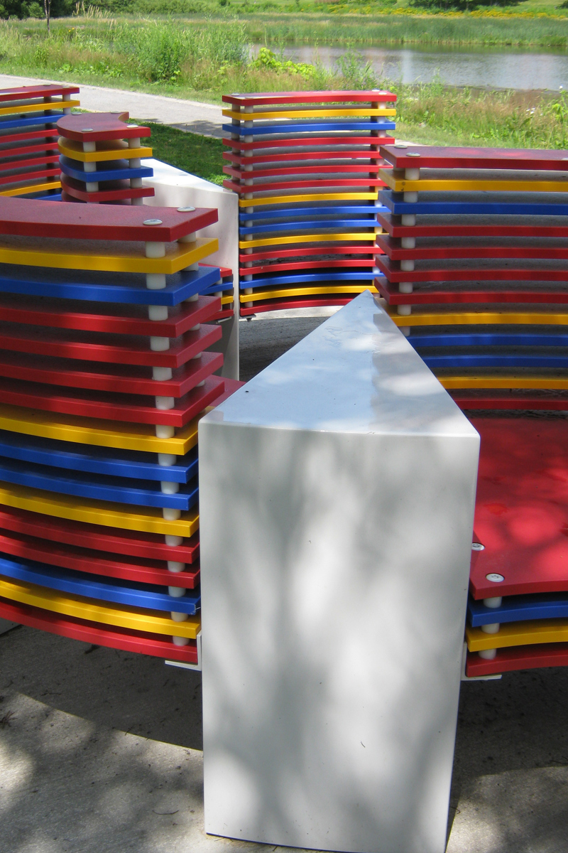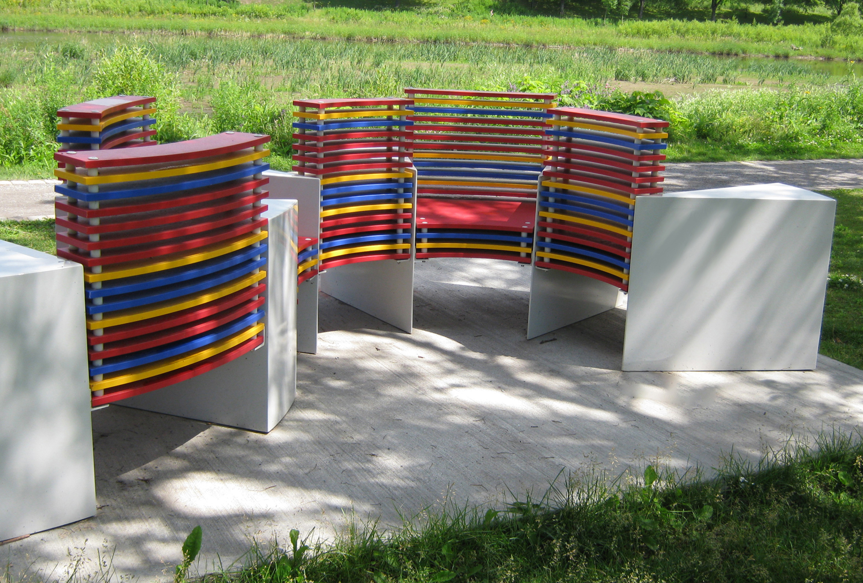 Colorée et ludique, la sculpture-banc réinterprète le confident, ce fauteuil ancien en forme de S où deux personnes peuvent s'asseoir en vis-à-vis. Les formes courbes ont été inspirées par les méandres de la rivière.