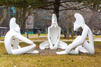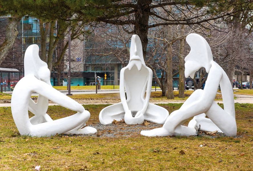Sur le terrain du Grand Théâtre, trois sages assis en cercle semblent en pleine discussion. Mais l’atmosphère est au calme et à la réflexion plus qu’à la dispute. Fidèle à sa manière minimaliste, Lewis Pagé a exprimé en quelques traits bien accusés la profondeur de l’esprit humain.