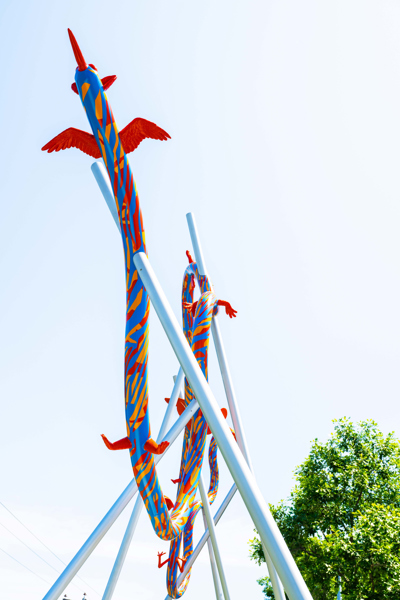 Du haut des airs, ce dragon contemporain convie le public à une escapade fantastique dans le parc. Sa danse enjouée évoque le simple plaisir d’aller bouger dehors. En créant des chimères du genre, l’artiste invite la nature en ville, plaidant ainsi pour une meilleure protection de la biodiversité.