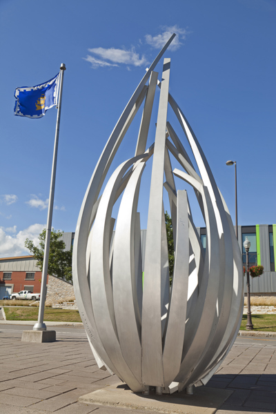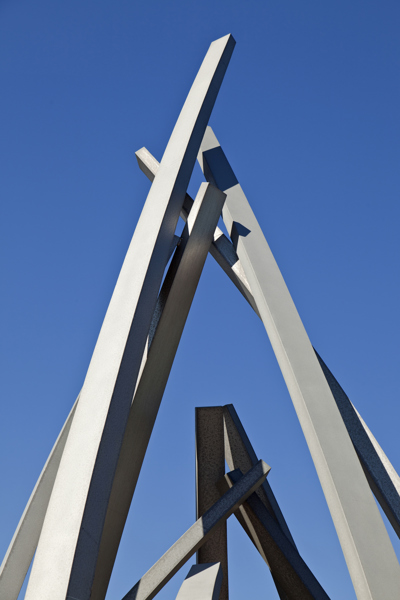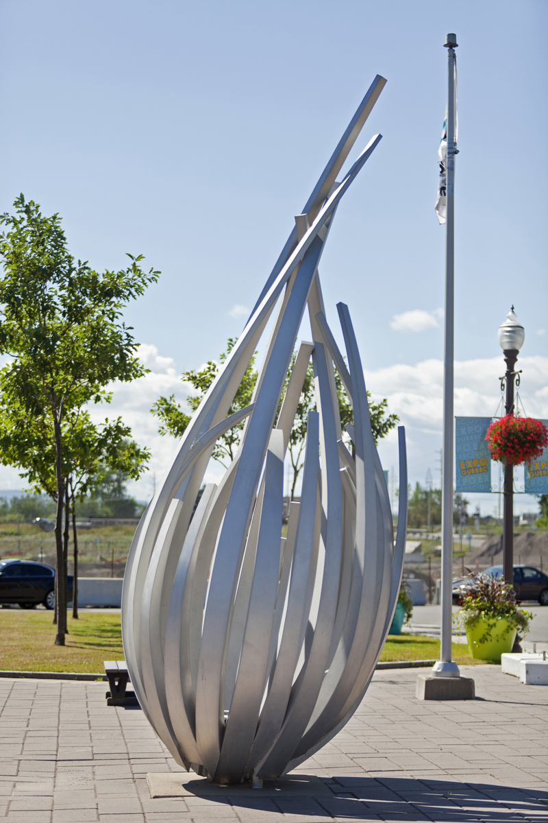 De loin, les grandes tiges de métal ressemblent à des bras jetés en l’air, prêts à célébrer à l’unisson un concert ou un événement sportif. Il faut s’approcher de la structure en aluminium pour prendre conscience d’une autre dimension de l’œuvre. On peut alors y distinguer un nid ou une corolle protectrice, abritant un être en devenir.