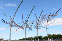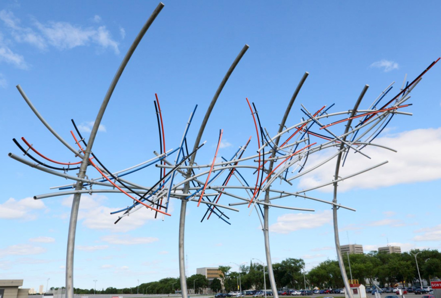 L’installation est constituée de deux alignements d’arcs porteurs auxquels sont attachés des tubes d’aluminium transversaux, également courbés, et qui, à leur tour, portent une multitude d’arcs colorés de plus petites dimensions. Ce foisonnement de coloris génère, de part et d’autre, un mouvement dynamique qui, au premier coup d’œil, insuffle à l’œuvre la figure d’une lancée, d’une impulsion.