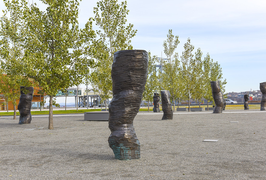 Ces 10 sculptures de bronze et d’acier inoxydable présentent à la main du passant une surface sensuelle qui rappelle l’écorce de bouleau. Ces « objets sans temps, sans sens », selon l’artiste, invitent à la contemplation en attirant le regard vers le fleuve. Le titre, tiré d’un poème de Rimbaud, évoque le sentiment d’éternité que la beauté arrive parfois à susciter en nous.