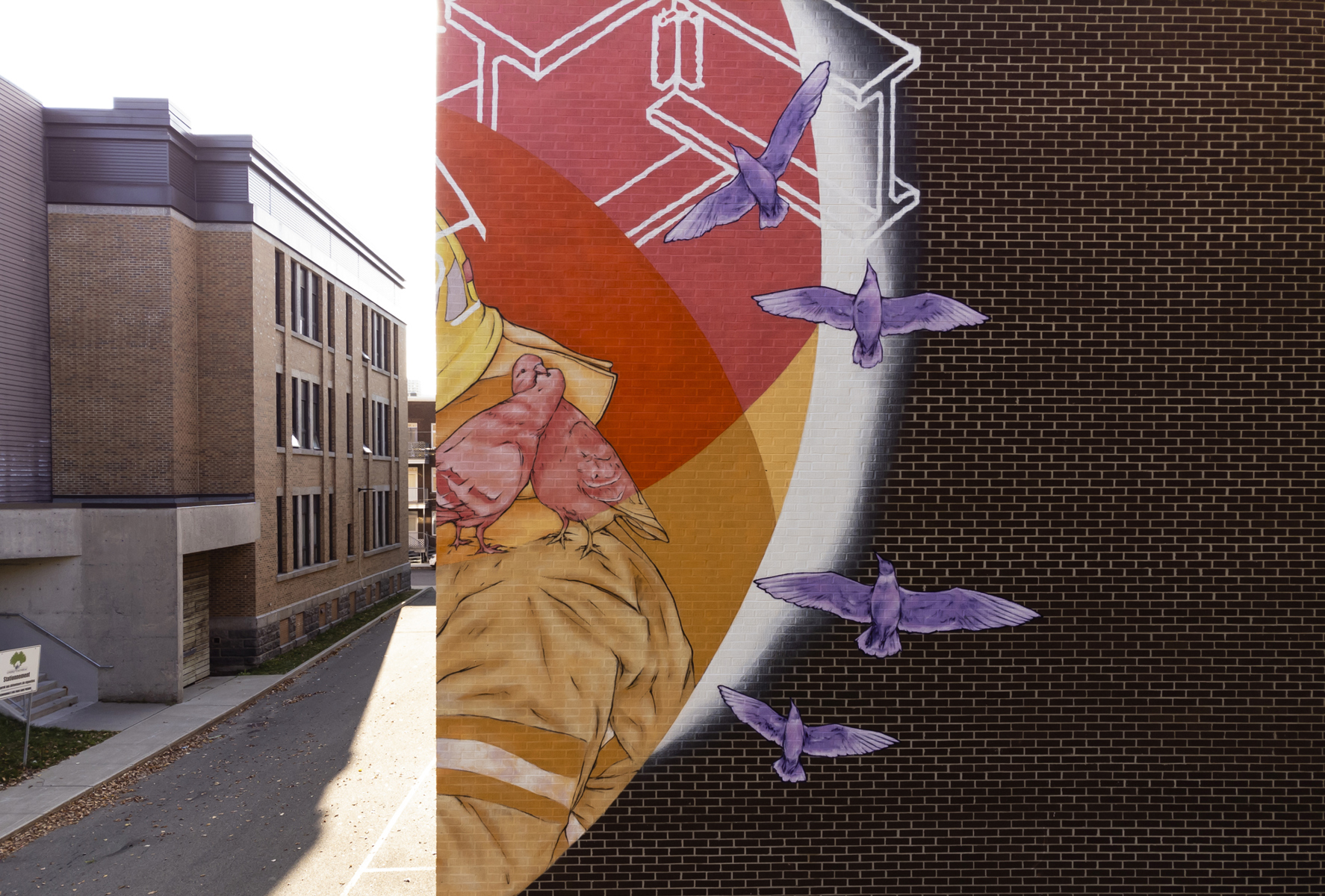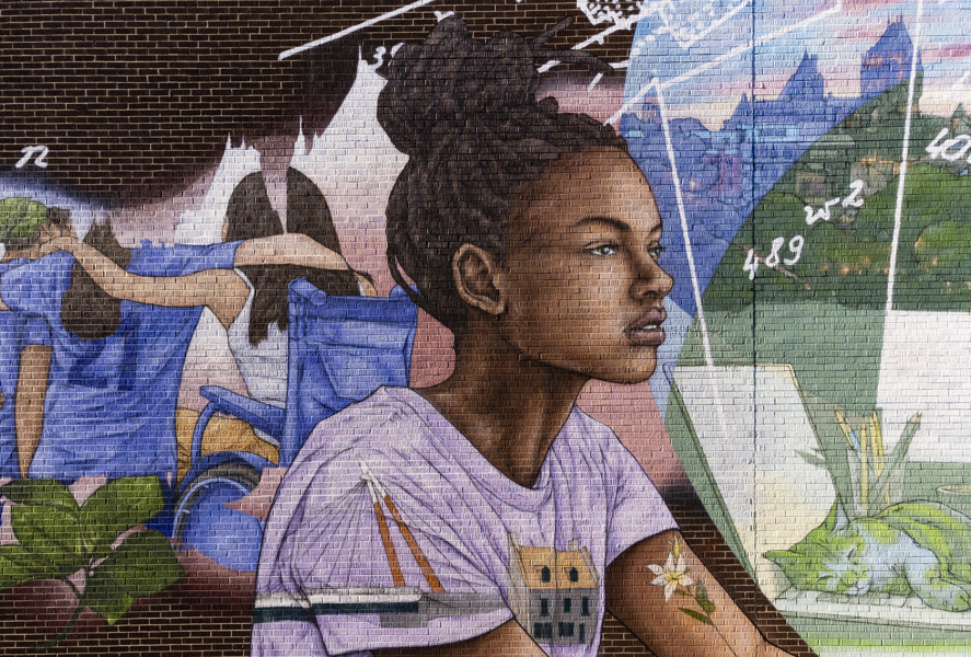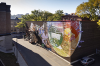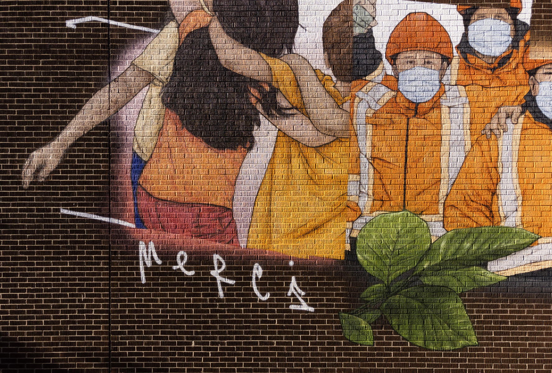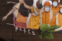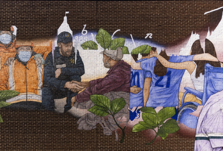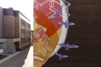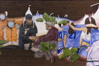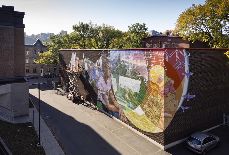 Émouvante, cette murale illustre les liens tissés entre le personnel municipal et les citoyens durant la pandémie. L’entraide, la solidarité et le souci de l’autre sont mis en scène dans un style réaliste tout en finesse. Au centre, le personnage principal porte des signes de reconnaissance et élève son regard vers un horizon rempli d’espoir.