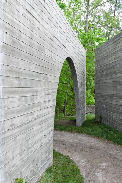 Les deux imposants monolithes en béton gardent les empreintes de leur coffrage d’origine en planches de bois récupéré. Colorations diffuses, stries et textures y composent une sorte d’écriture abstraite que chacun peut déchiffrer à sa guise. Le temps qui passe imprimera ses effets sur ces pages, proposant sans cesse de nouveaux récits.