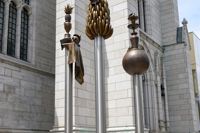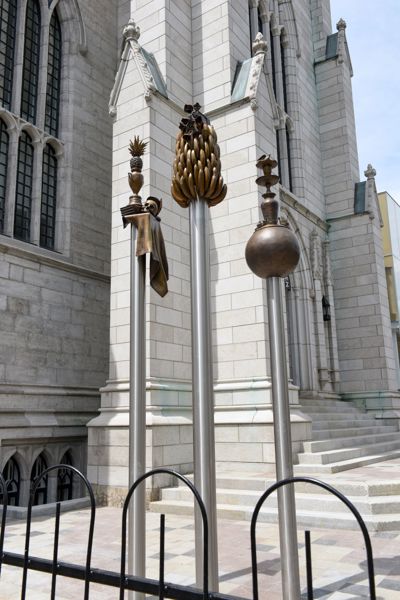 Trois mâts soutiennent un assemblage hétéroclite d’objets réalistes coulés en bronze. Un crâne humain, un régime de bananes, une boule disco… belle énigme à décoder! En fait, cette nature morte contemporaine rappelle que la vie est éphémère et que la vanité humaine doit être endiguée. Elle nous invite à revenir à l’essentiel, peut-être en fréquentant la bibliothèque voisine, lieu de pensée et de culture.