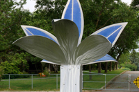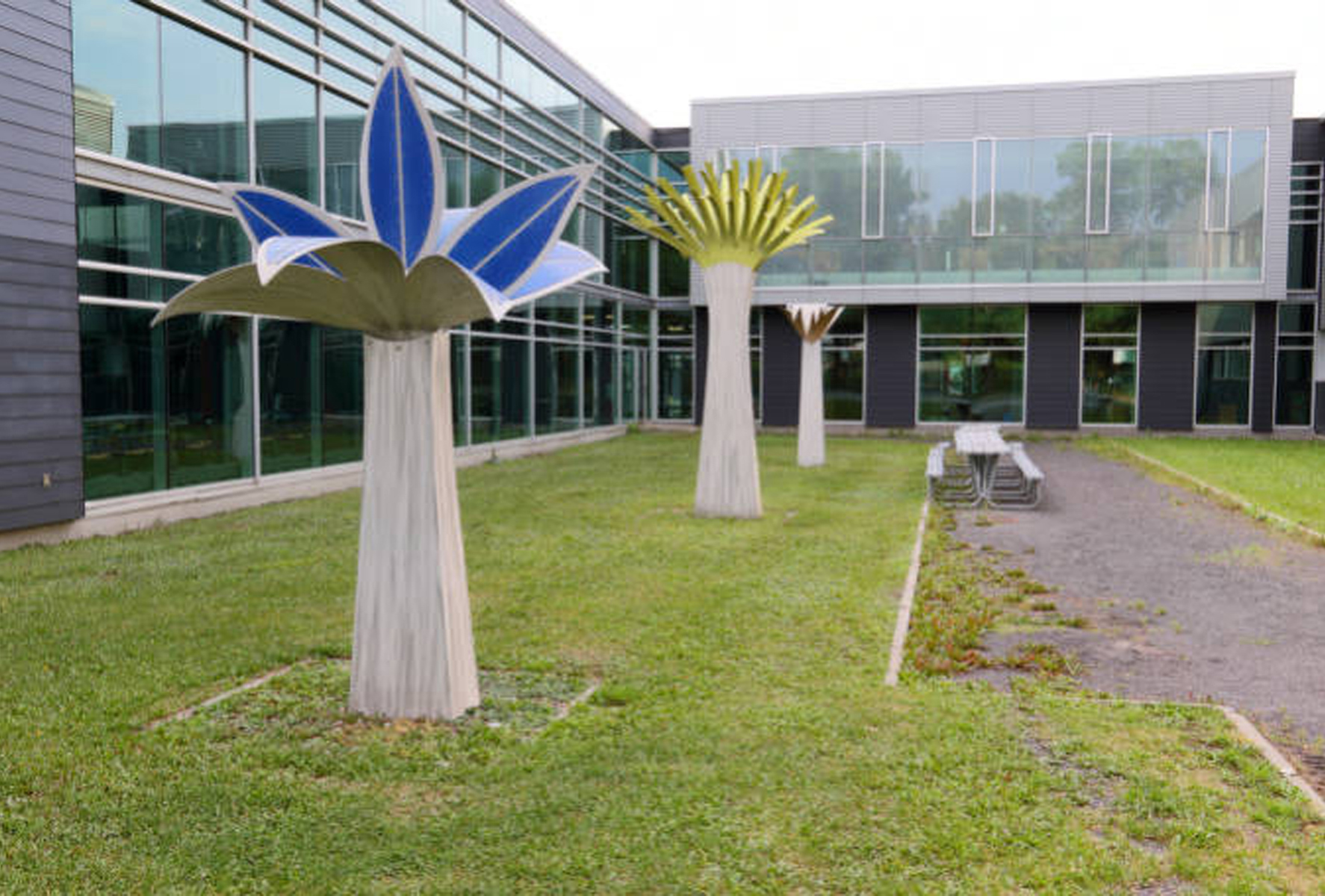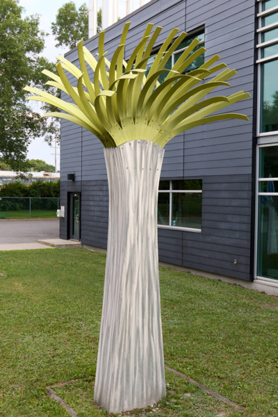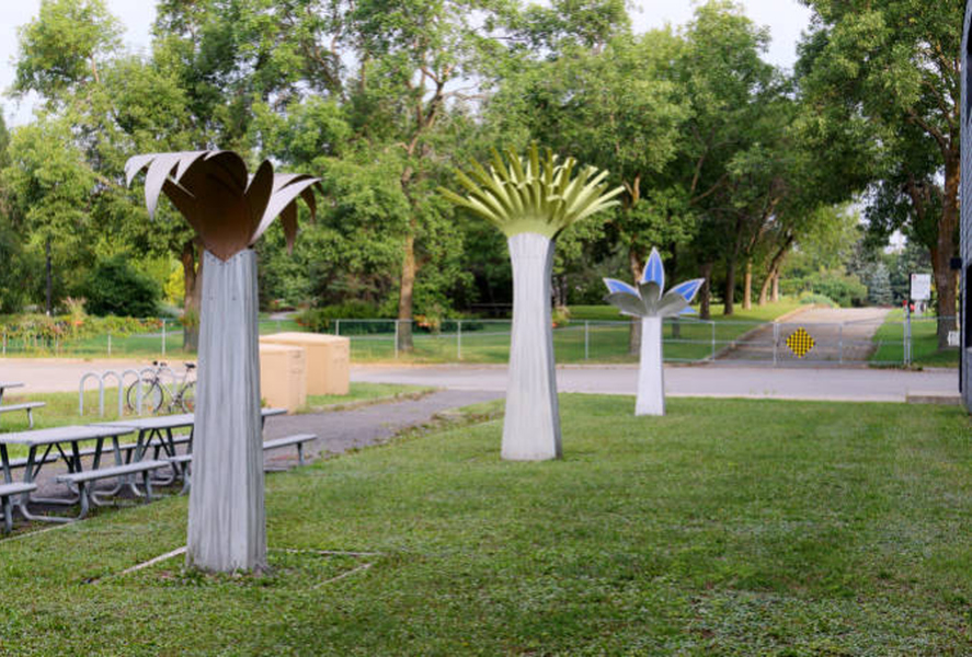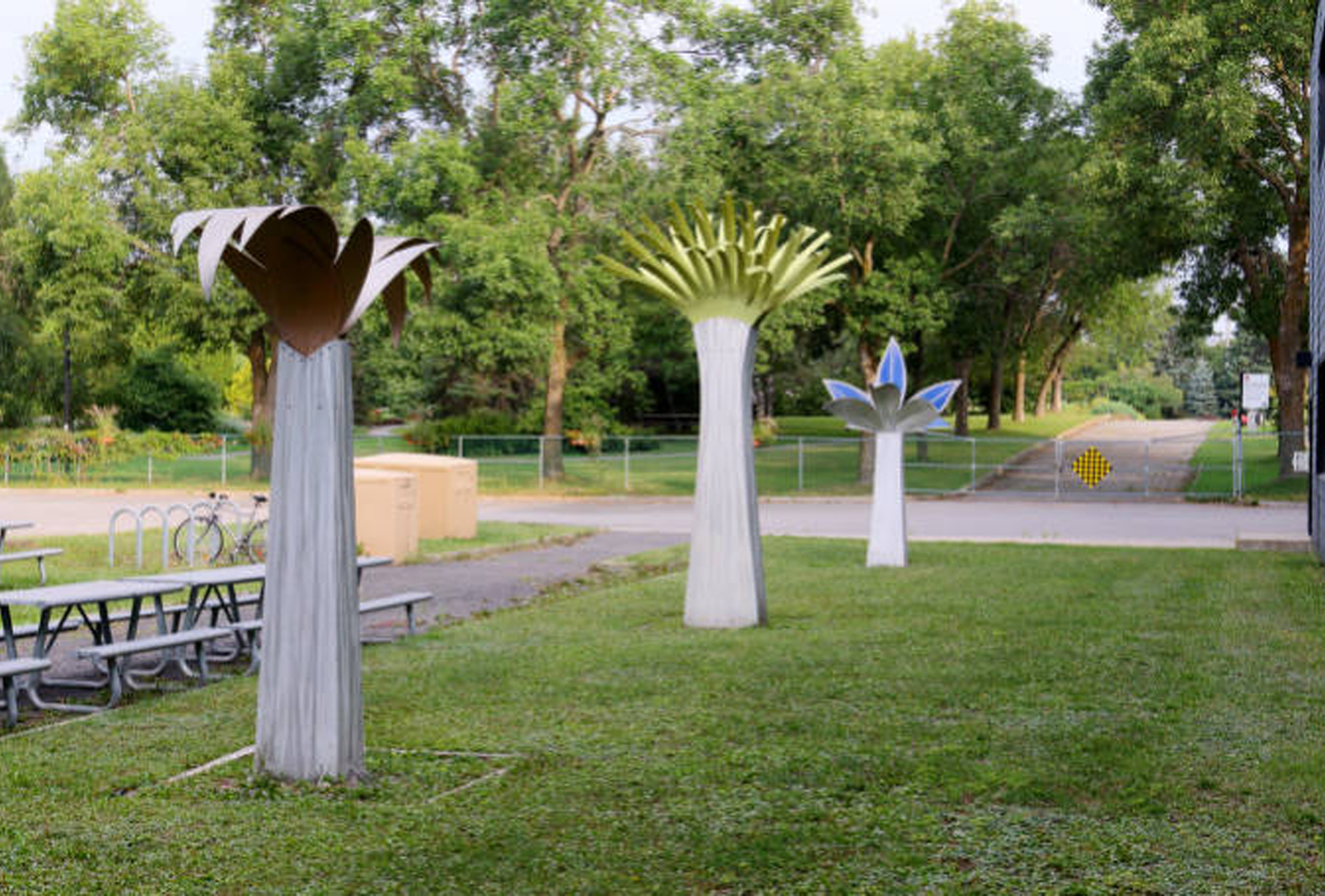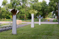 Les trois autres formes, situées dans le jardin, représentent trois arbres imaginaires implantés en alternance avec de véritables féviers. Le premier arbre représente le laurier et plus généralement les fines herbes, la nourriture bien assaisonnée et tous les plaisirs rattachés au goût. Le second arbre représente un croisement entre les ailes d'un papillon et les feuilles rendues à maturité. C'est un rappel de la fin des récoltes et de la mise au grenier en prévision de leur prochaine transformation. Le troisième arbre représente le blé, l'alfafa et les graminées. Son feuillage très fourni est le signe de l'abondance.