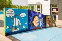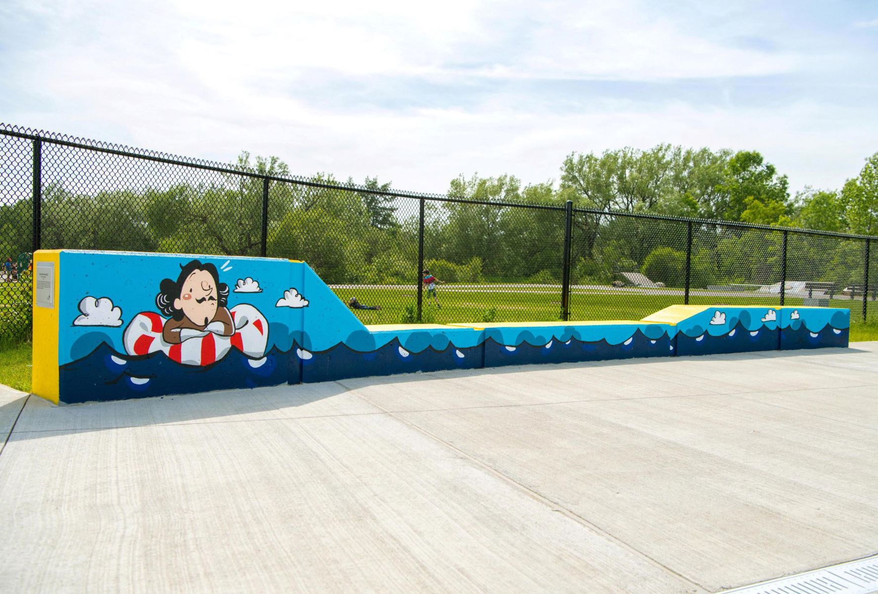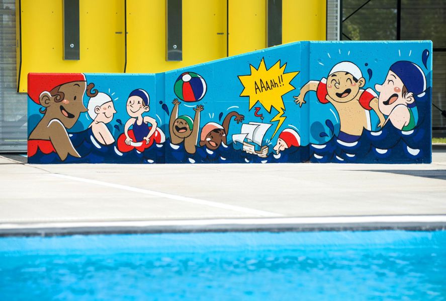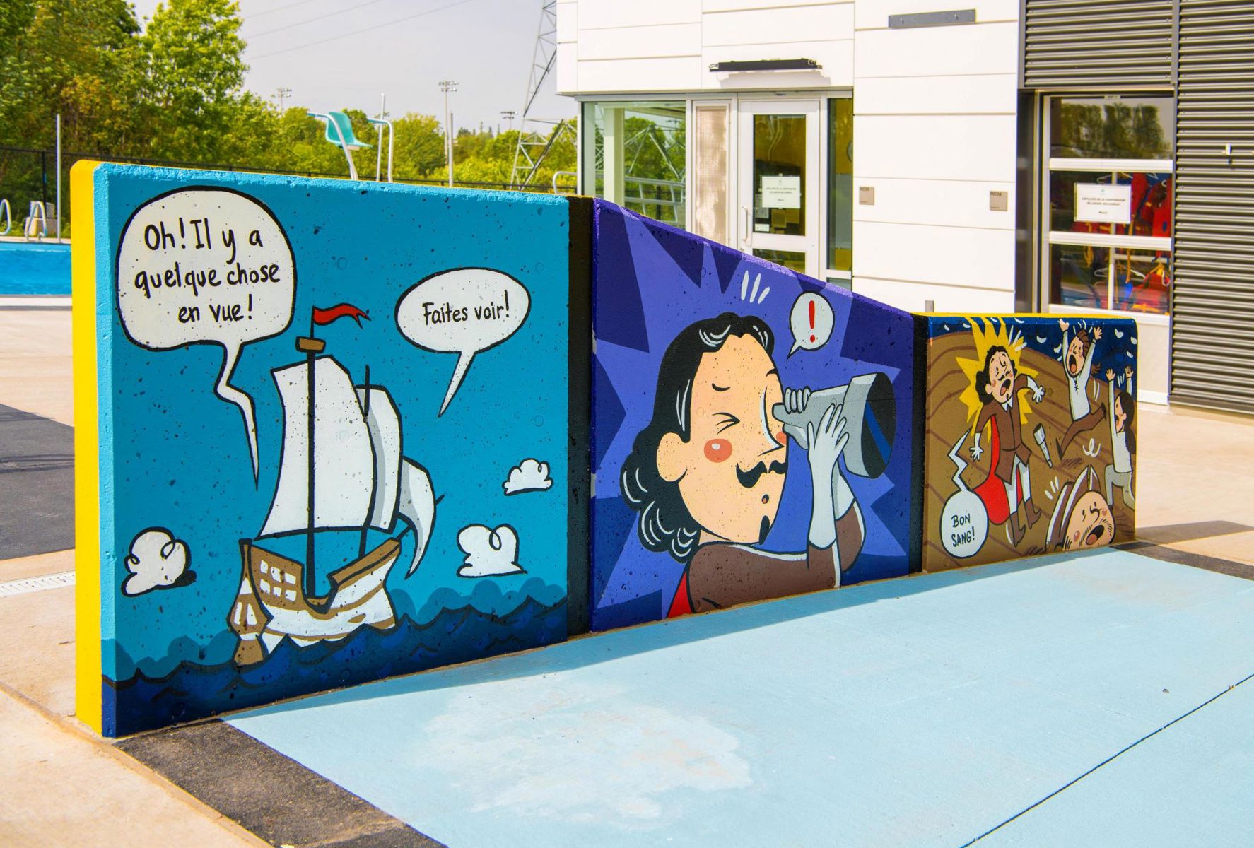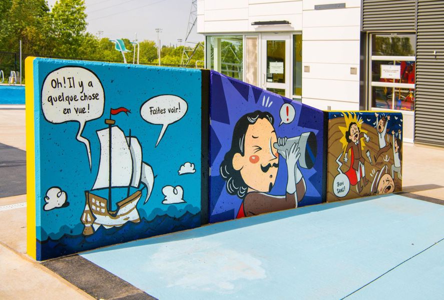 Clin d’œil loufoque à la fondation de Québec, cette bande dessinée géante revisite la traversée de l’Atlantique entreprise par Samuel de Champlain en 1608. Elle fait vivre à l’explorateur un épisode bien cocasse, inconnu des historiens! Cette œuvre amusante aux couleurs vibrantes invite les baigneurs de tout âge à plonger dans l’art.