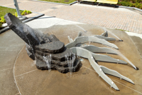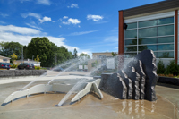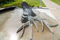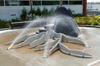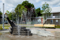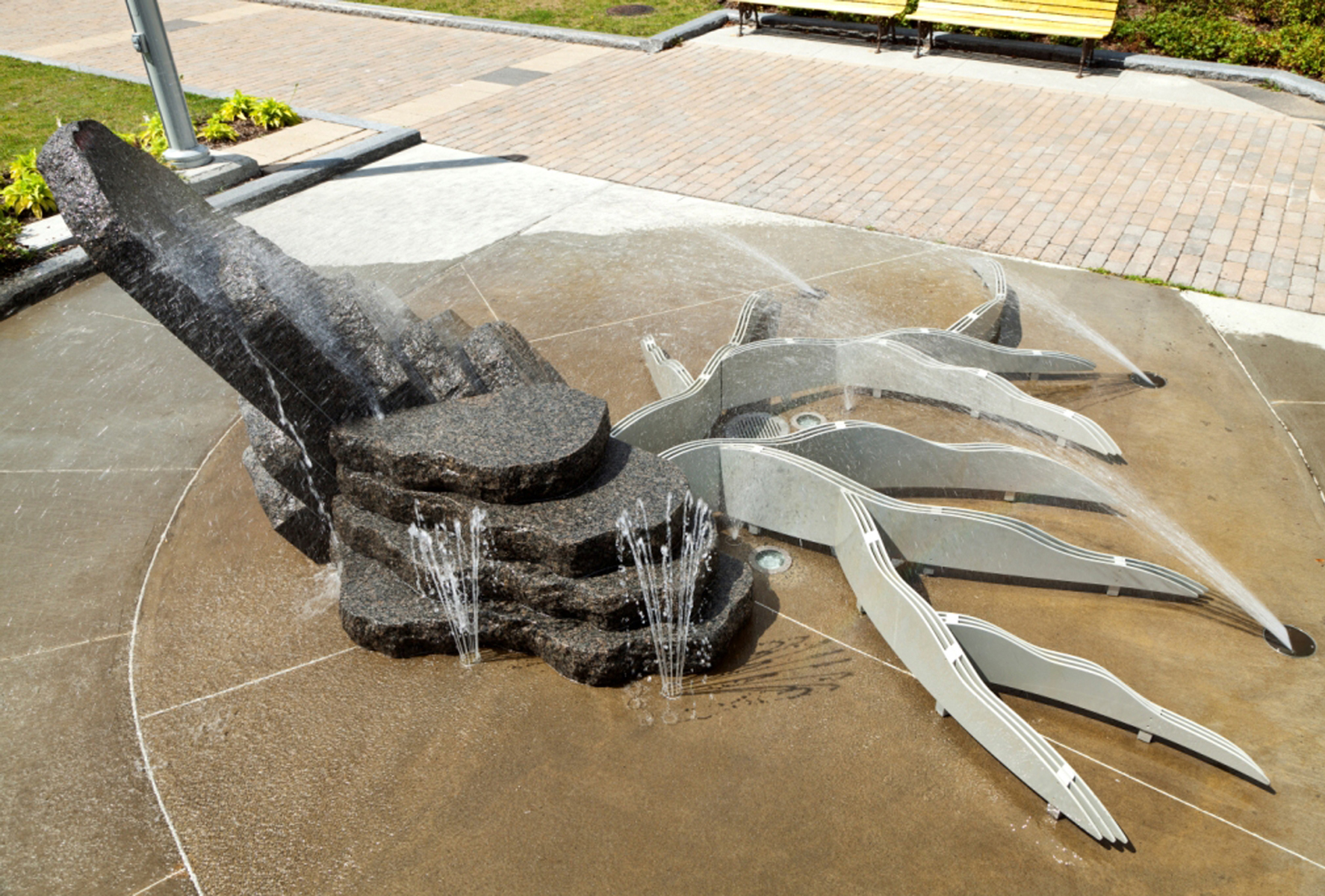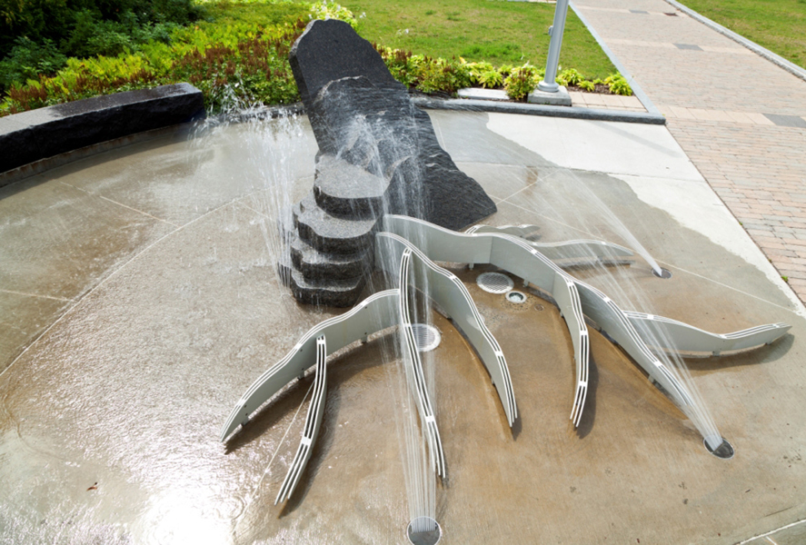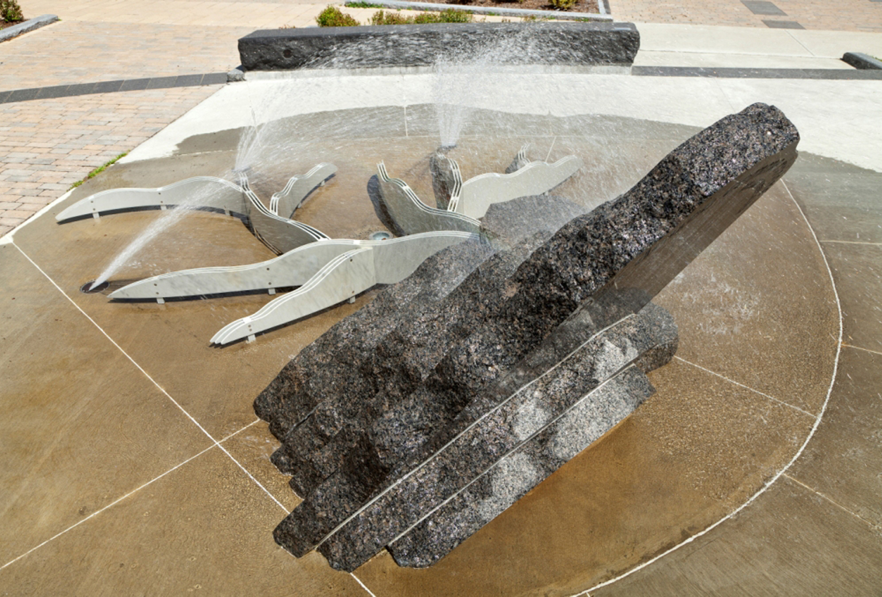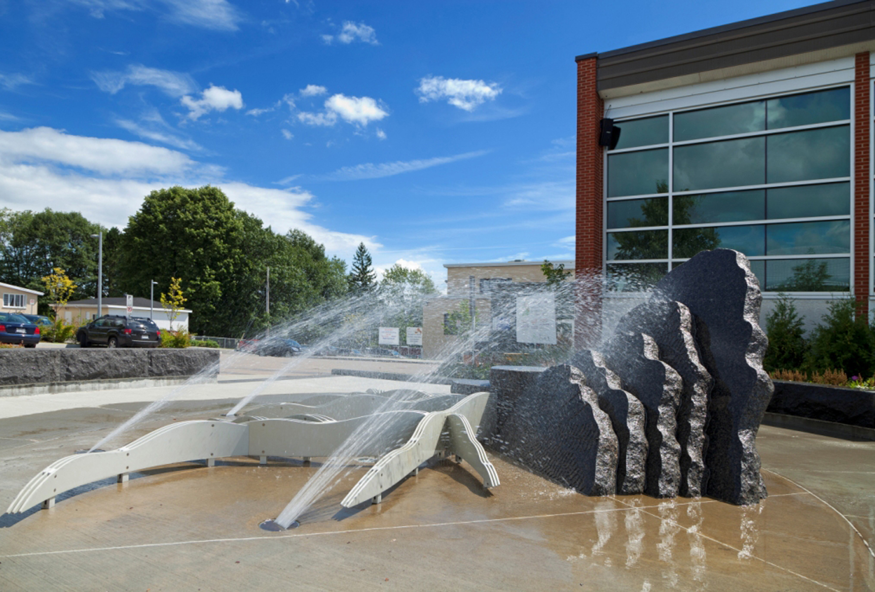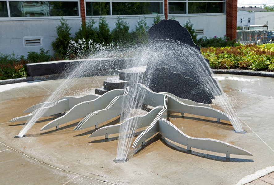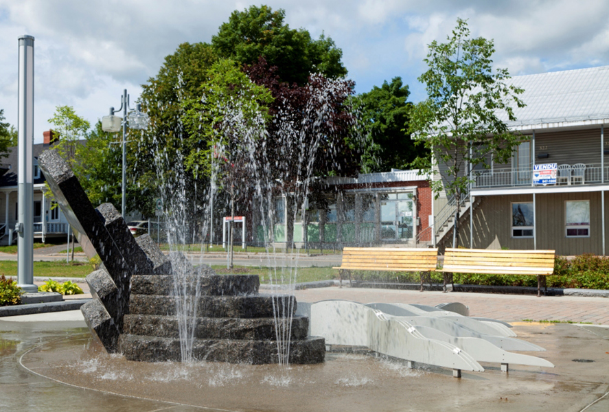 « Je vous entends rêver, douce comme rivière ». Extraite de la chanson Les gens de mon pays, de Gilles Vigneault, cette phrase a inspiré le titre de la sculpture-fontaine. L’œuvre est composée de deux masses de granit sombre aux formes irrégulières simulant le mouvement de la croûte terrestre qui a donné naissance au paysage environnant. À leur base émergent des lames d’aluminium brillant qui ondulent en tous sens, telles les rivières qui parcourent le territoire.