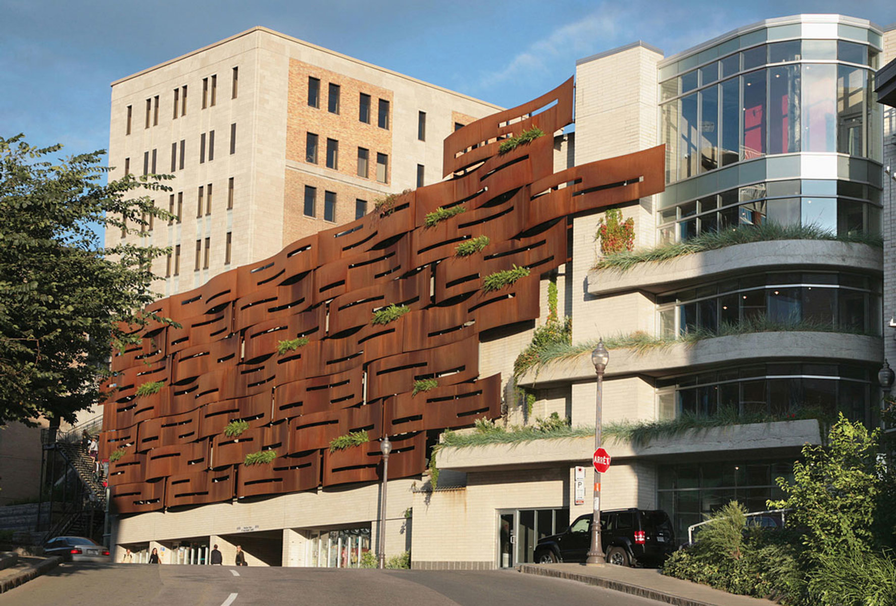 Cette œuvre tout en ondulations qui flamboie sous la lumière du jour est le fruit d’une étroite collaboration entre l’artiste et l’architecte. Tous deux ont tiré parti de la forme irrégulière du terrain pour magnifier la falaise avec une véritable œuvre d’intégration, une « archi-sculpture », selon l’expression de l’artiste.