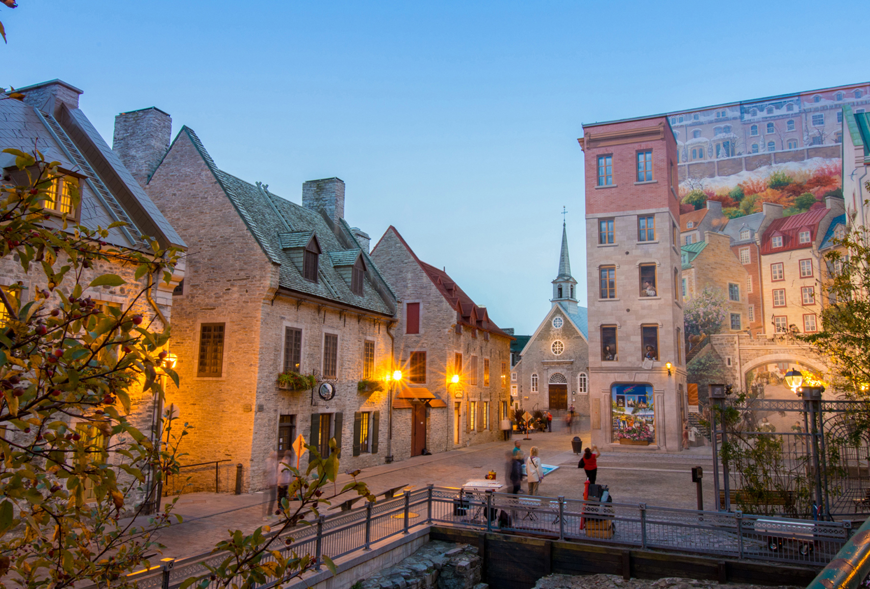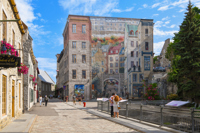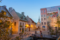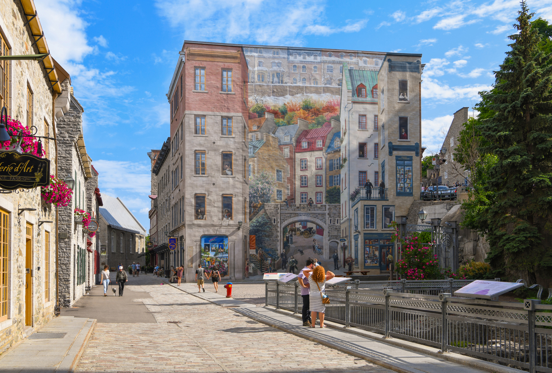 Cette fresque en trompe-l’œil, en plus de rendre hommage à des personnages historiques, met en relief les caractéristiques spécifiques de Québec : son architecture, ses fortifications, ses escaliers, etc.