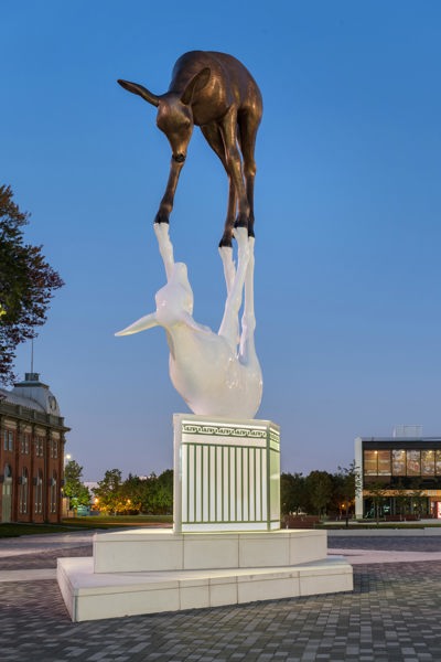 Monumentale, cette rencontre improbable fait tourner les têtes sur la place Jean-Béliveau. La sculpture de bronze de plus de 11 mètres de haut met-elle en scène un cerf penché sur son reflet? Ou un face-à-face avec autre cerf? Sa présence rappelle que la forêt n’est pas si loin de la ville de Québec. Le socle comporte un motif en lame de patin inspiré des rambardes d’escalier traditionnelles du quartier.