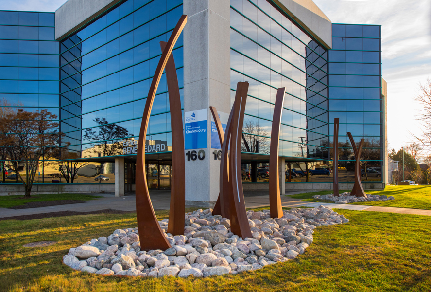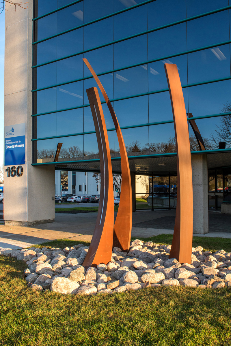 Inspirée par de multiples échanges entre l’artiste et un groupe de bénévoles de Charlesbourg, cette œuvre traduit des valeurs d’entraide et de fraternité. Elle prend la forme de neuf figures sculpturales dont la silhouette inclinée évoque certaines présences bienveillantes, des êtres attentifs à l’autre, dans une attitude d’ouverture.