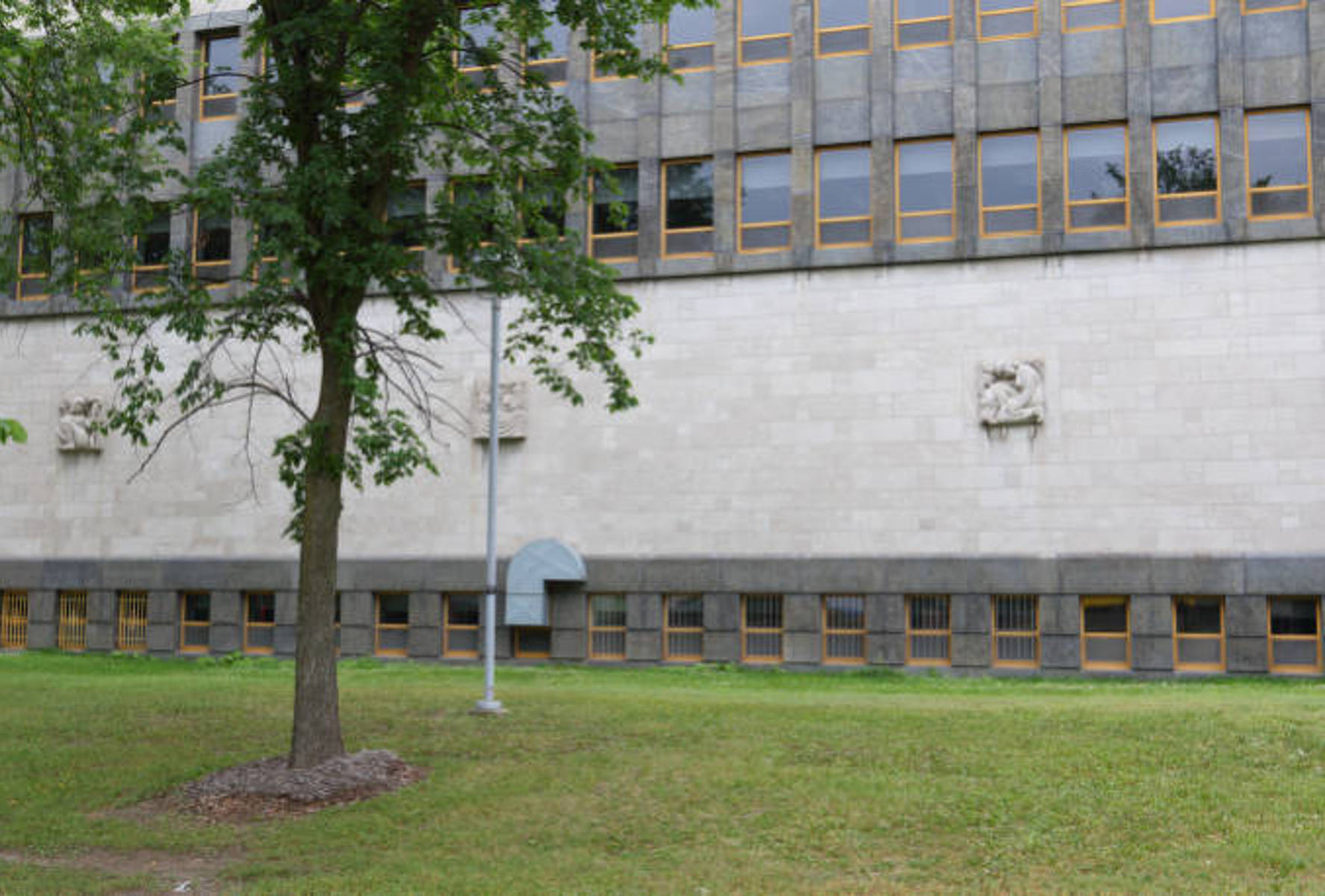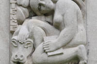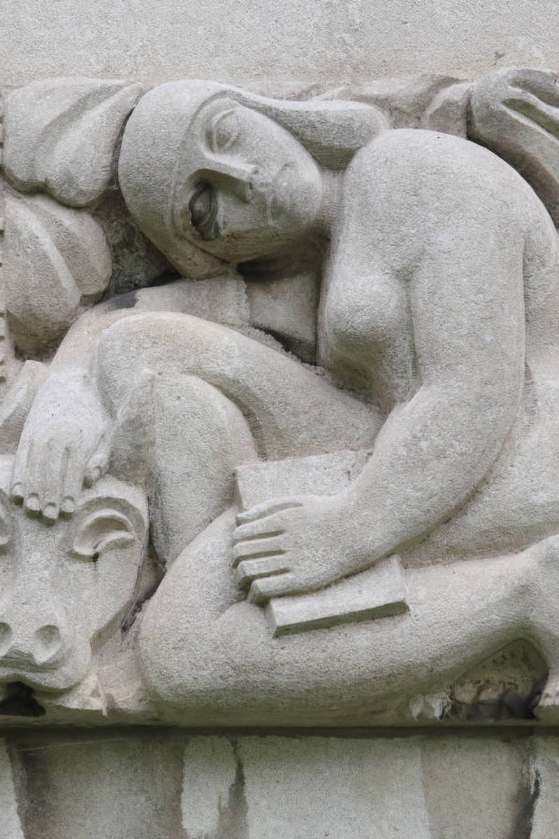 La sculpture représente une femme tenant de sa main gauche un livre, symbole de la connaissance, et repoussant de sa main droite la tête d'une âne, symbole de la stupidité et de l'entêtement.