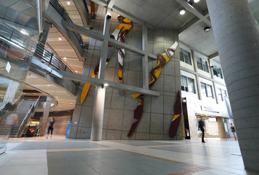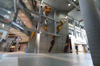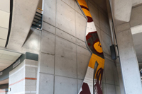 La sculpture illustre un extrait du poème « Le bateau ivre » écrit en 1871 par l'auteur français Arthur Rimbaud. Cet extrait a été choisi pour illustrer les notions de force, de déséquilibre et de mouvance exprimés par l'immensité du lieu : la vastitude du passage, l'atrium couronné d'une série d'ouvertures vitrées, le mur penché dans lequel viennent buter les structures des étages. Cet ensemble architectural donne l'impression d'être face à la coque d'un bateau à la dérive: le bateau ivre. Cet extrait fait aussi appel à l'intemporalité de l'art: un lien entre le passé et le futur qui suggère la continuité et la reconnaissance du vécu humain par le moyen de l'expression créatrice. Les formes organiques rappellent celles des éclairs et dynamisent la surface du mur à la pinceaux font référence au travail de la main de l'artiste. La trame des circuits électroniques (mur de béton) répond à l'ossature de l'architecture.