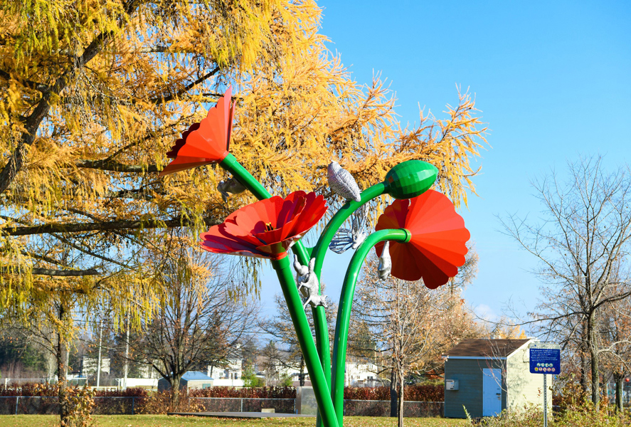 L’œuvre est née d’une démarche de cocréation avec un groupe d’élèves de l’école L’Odyssée. Explorant la flore et la faune du parc de La Chanterelle, ils ont vu la fleur du souvenir s’immiscer dans leurs travaux. Le duo Demers-Mesnard en a tiré un vibrant hommage à la population de Val-Bélair et aux nombreuses familles de militaires des alentours.