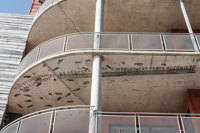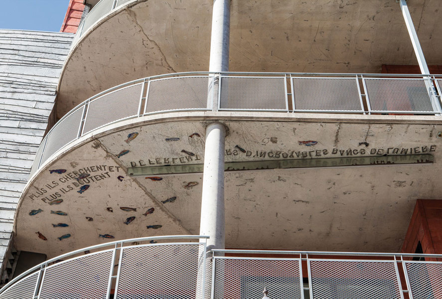 Aux plafonds des balcons des Ateliers du roulement à billes, la surface bétonnée est parcourue de motifs de poissons accompagnés de l’inscription « Plus ils cherchent plus ils doutent ». Une allusion à l’activité créatrice régnant dans l’immeuble qui abrite des ateliers-résidences et des locaux de l’École des arts visuels.