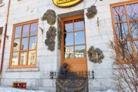D’inspiration baroque, des hauts-reliefs fortement texturés tranchent sur le gris de la pierre et décorent la porte maintenant condamnée.