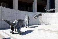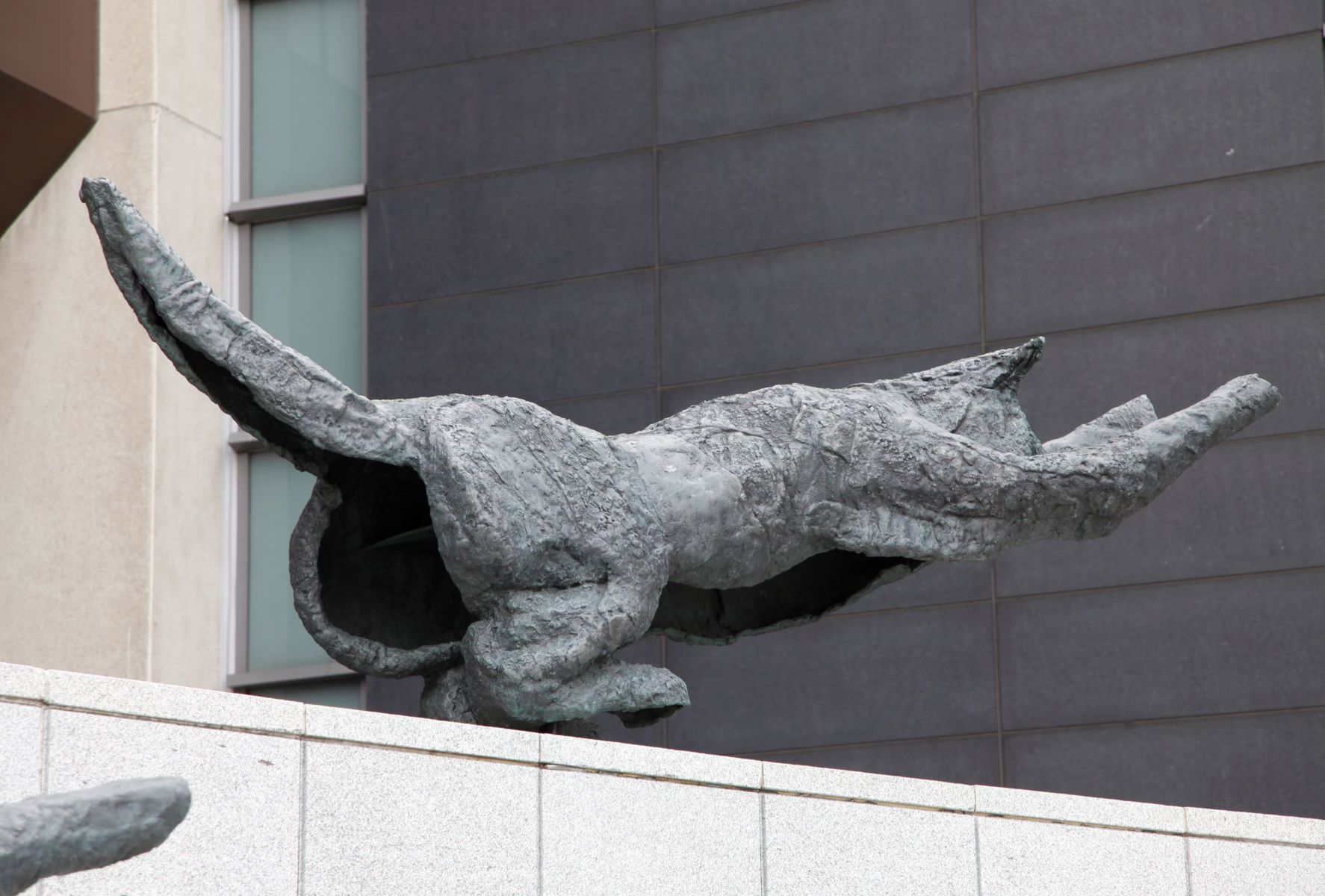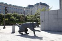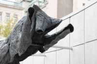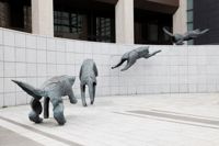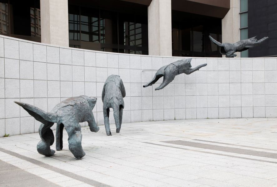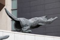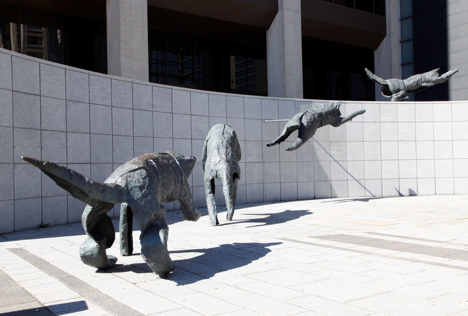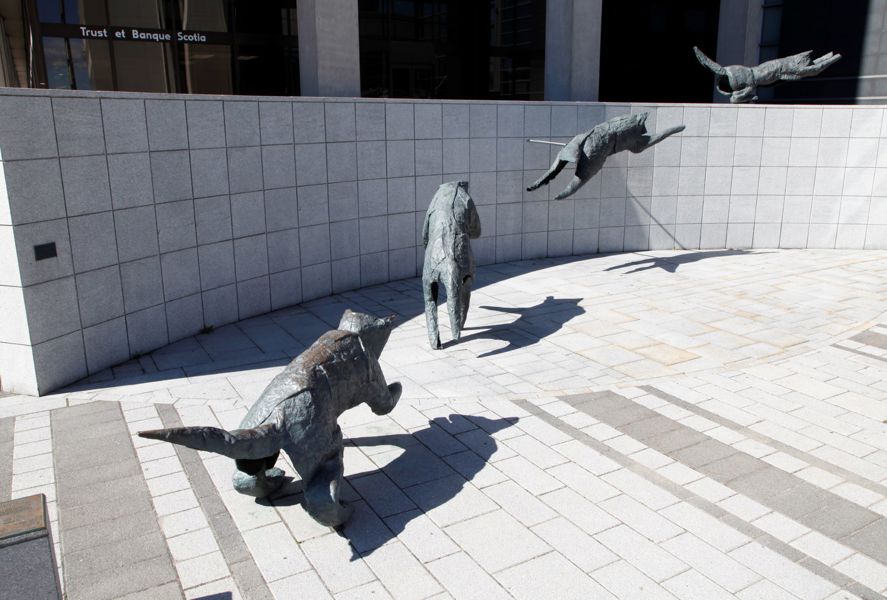 Bien intégré à l’architecture et à l’environnement urbain, ce groupe de bronzes reconstitue le mouvement d’un animal en plein élan.