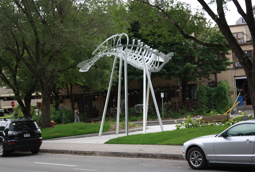 Membrures, arêtes et ondulations composent cette sculpture inspirée de la charpente d’un voilier, qui elle-même fait penser à l’ossature d’un poisson. Avec sa figure de proue en silhouette, le Roi du fleuve semble accoster à l’entrée du parc. Le titre reprend le surnom donné au John Munn, premier bateau à vapeur à sillonner le Saint-Laurent au 19e siècle, époque des grands chantiers navals.