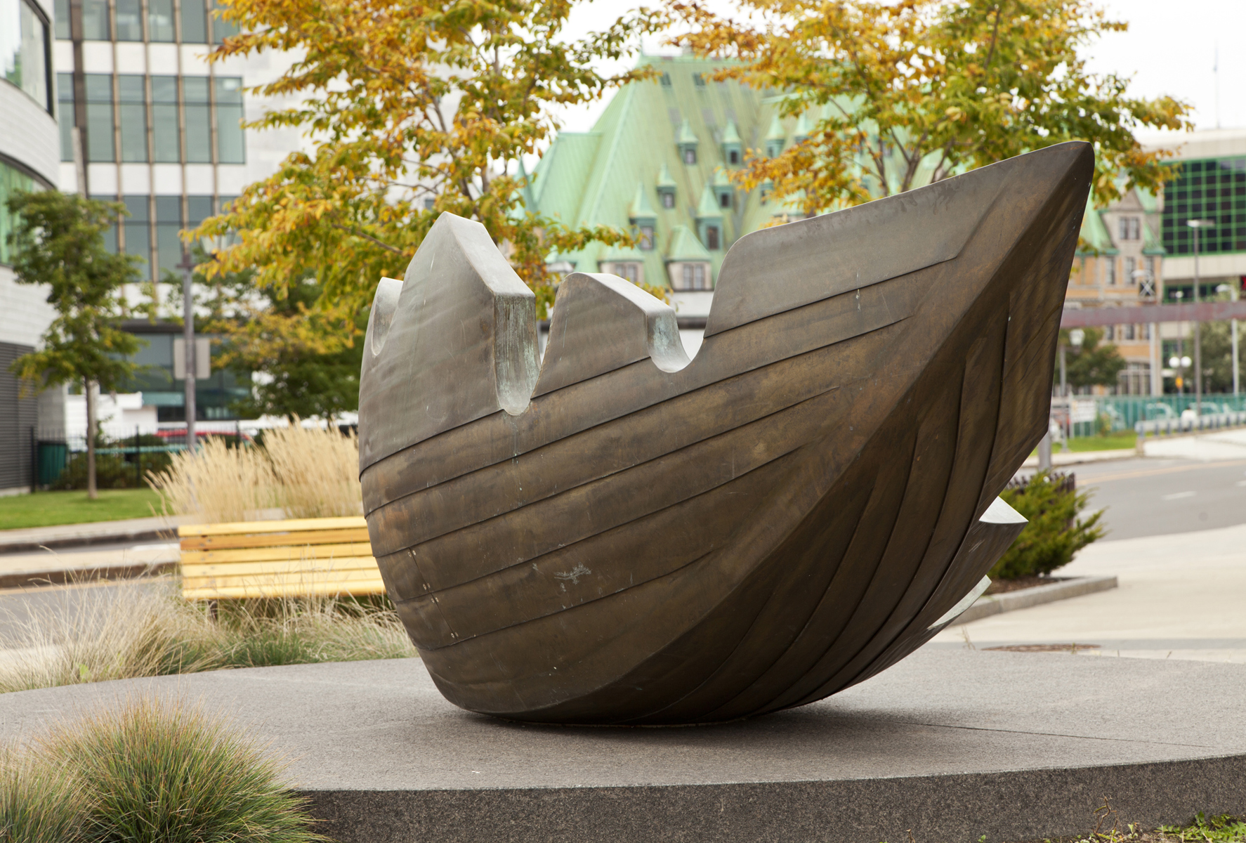 Une barque-feuille pourvue de ses bordages et tapissée de nervures rappelle l’importance du transport maritime dans le peuplement et l’essor commercial de Québec. Elle figure en même temps le voyage, l’enracinement et la métamorphose. Deux bollards placés à proximité sont gravés des premiers vers d’un poème de Saint-Denys Garneau. L’œuvre est un don de la Chambre de commerce de Québec.