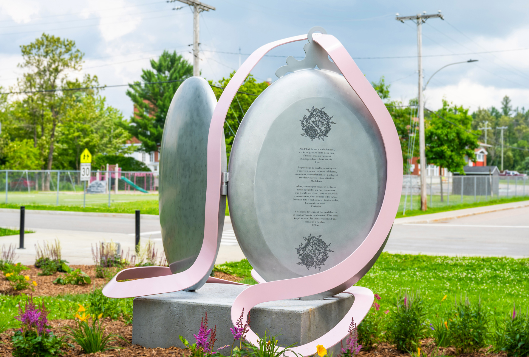 Cette œuvre rappelle l'importance du legs féminin intergénérationnel qui jette des ponts entre le passé et l'avenir. Fruit d'une collaboration avec un groupe communautaire de femmes, elle célèbre la solidarité féminine. Les fleurs symbolisent l'affection mutuelle des femmes, alors que leurs mains évoquent leur tradition artisanale. Sise à l'ancien emplacement de l'église Bon-Pasteur, témoin de la fondation et des activités du groupe, cette création met en lumière le potentiel de ce lieu de partage d'expériences et de savoir-faire.