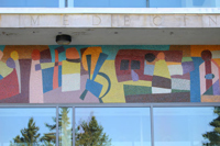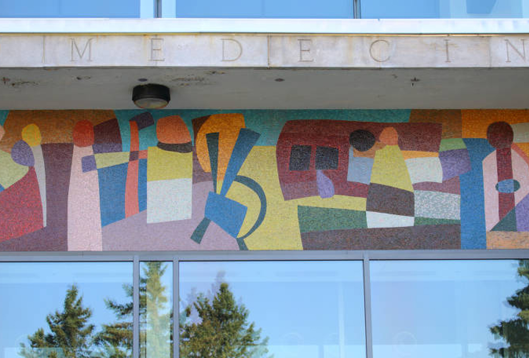 La mosaïque représente l'évolution de la médecine depuis ses origines jusqu'à son stade moderne et technique, tant dans le prolongement de sa recherche que dans son application en milieu hospitalier, en référence aux activités théoriques et pratiques prévues dans le complexe médical de l'Université Laval.