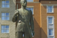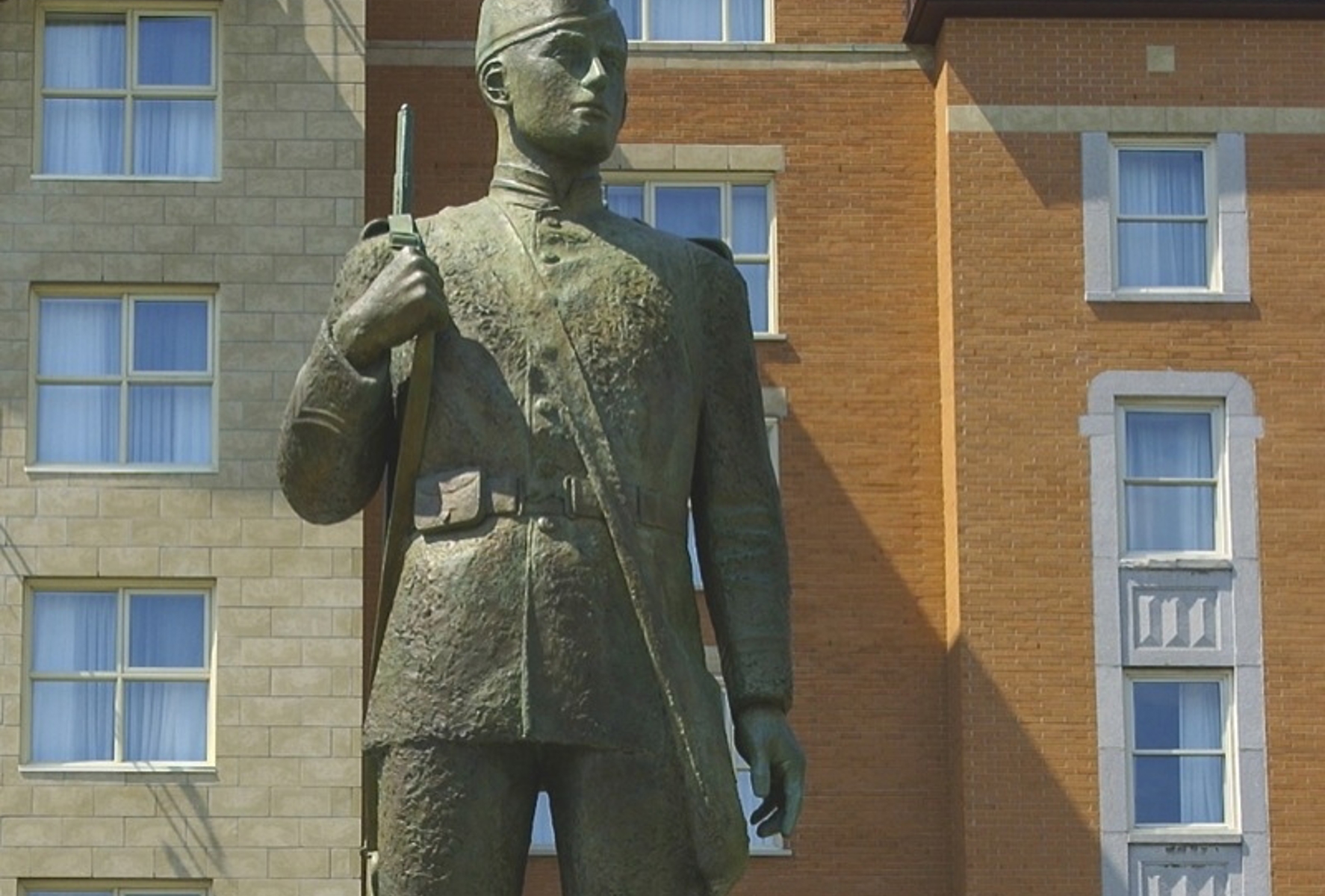 Constitué en 1862, le régiment des Voltigeurs appartient au patrimoine de la ville de Québec à titre de plus ancien corps de troupe canadien-français. Le monument immortalise un carabinier, arme en bandoulière et coiffé du calot que portaient les soldats chargés de rétablir la paix lors de la rébellion des Métis du Nord-Ouest en 1885.