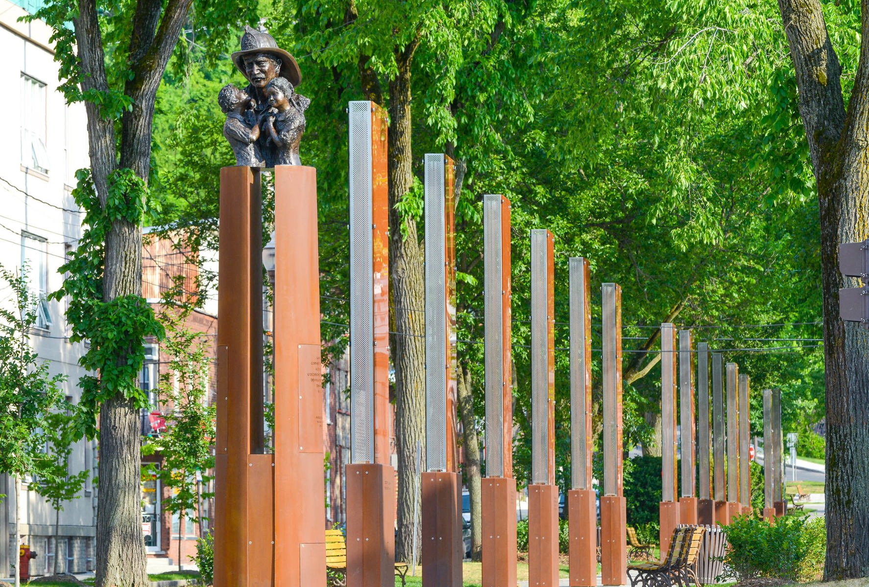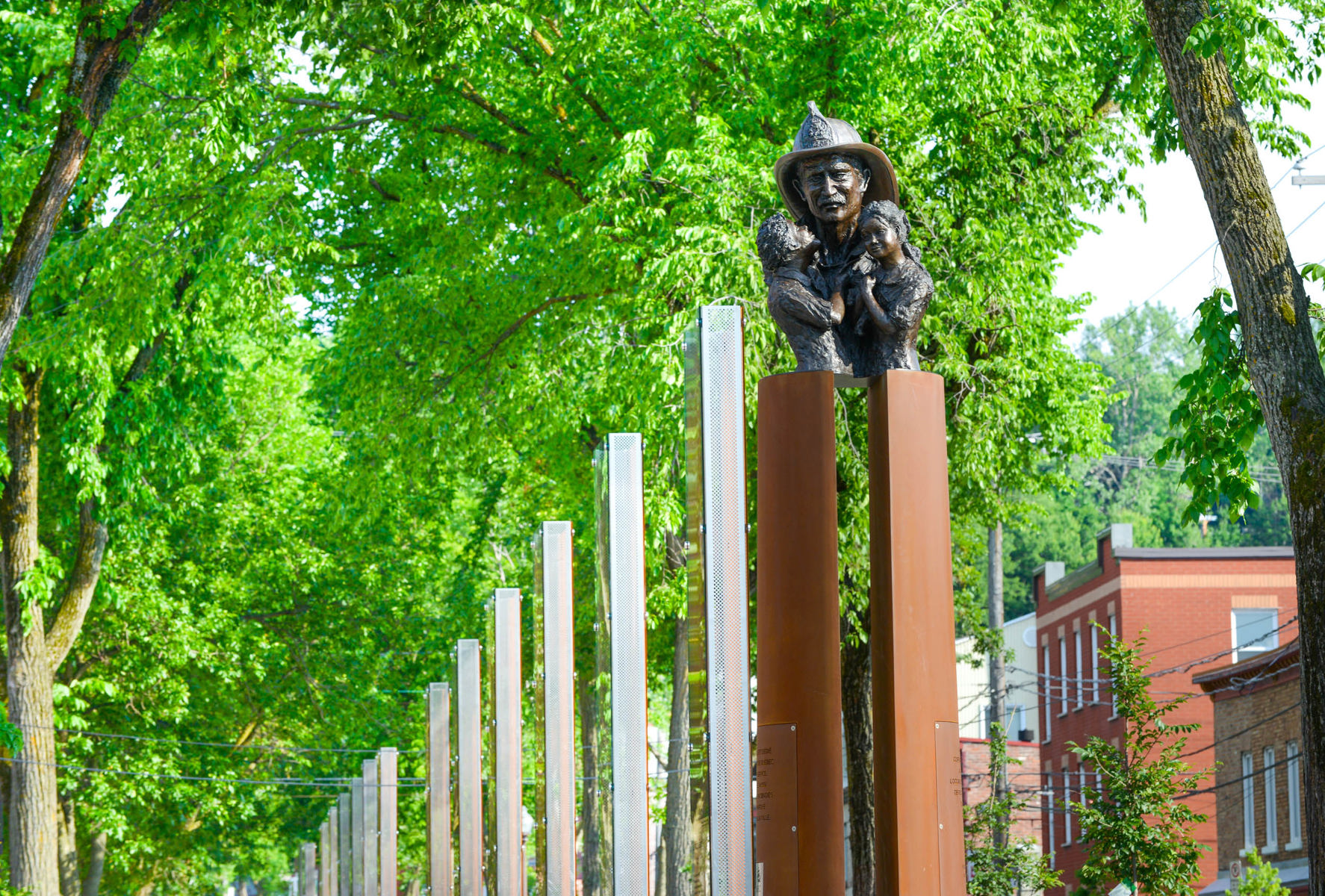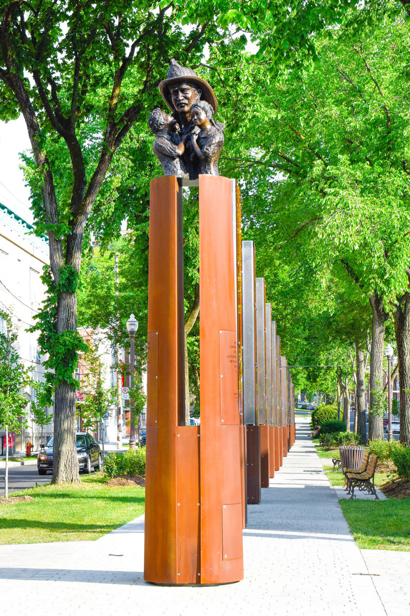 Cette sculpture d’un pompier tenant deux enfants dans ses bras exprime la fragilité de la vie, mais aussi la sagesse et la confiance acquises à travers la souffrance. Réalisée à l’occasion des Jeux mondiaux des policiers et pompiers tenus à Québec en 2005, l’œuvre a été intégrée au mémorial créé en 2016 sur le boulevard Langelier. Ce lieu de mémoire rend hommage aux pompiers morts en service et rappelle les terribles incendies qui ont ravagé la ville.