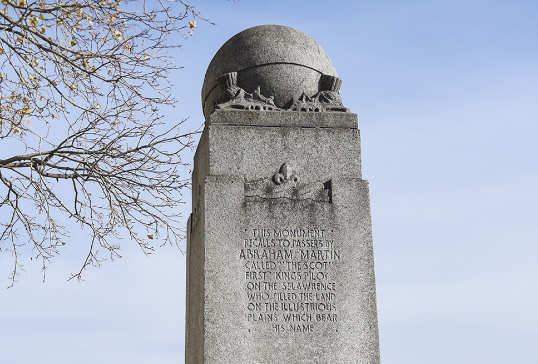Ce piédestal en granit surmonté d’un globe terrestre rend hommage à Abraham Martin, dit l’Écossais. Débarqué à Québec vers 1620, l’homme fera sa marque comme pêcheur et agriculteur. Le monument comporte quatre chardons, emblèmes écossais, et des fleurs de lys jaillies des flots, qui symbolisent les exploits de ce pilote du Saint-Laurent. En ce lieu précis, des milliers d’immigrants sont arrivés par bateau au 19e siècle.
