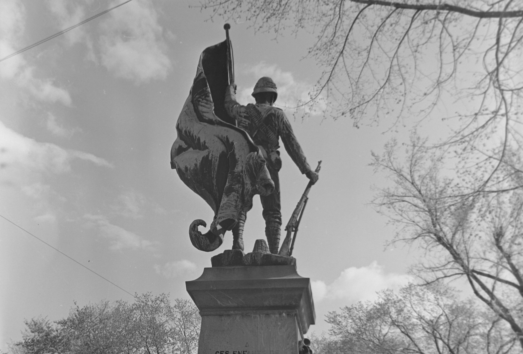 colonial, le soldat tient d’une main une carabine et de l’autre le Red Insign, le drapeau canadien de l’époque.