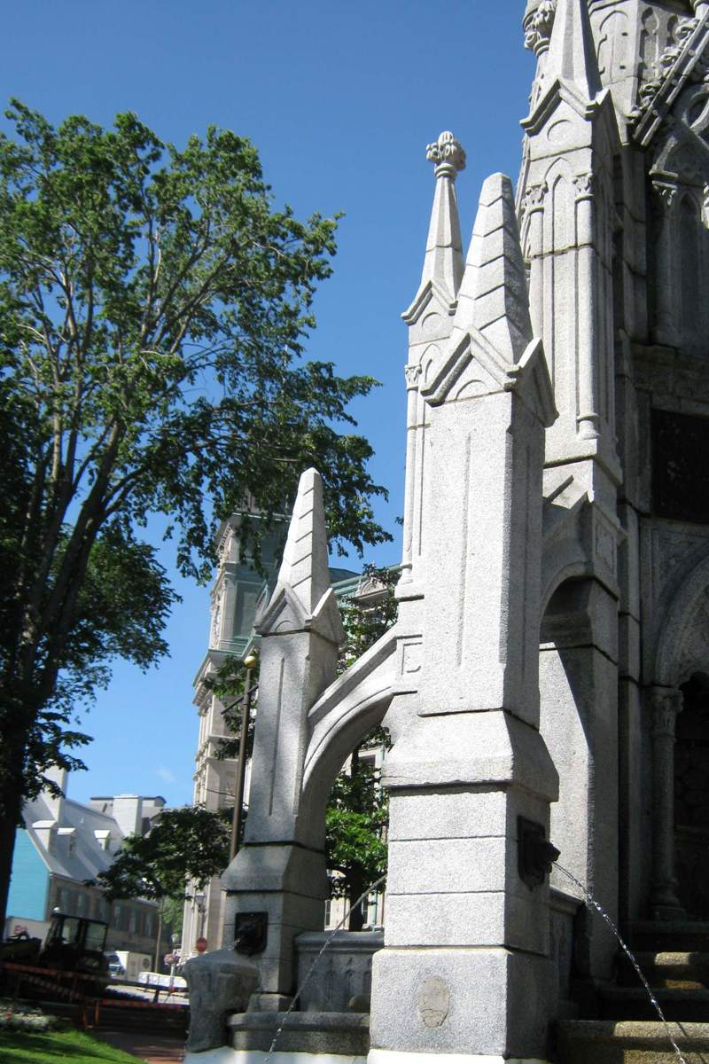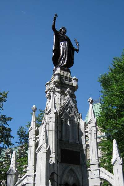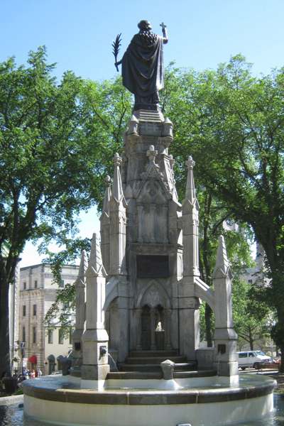 Le monument-fontaine de style néogothique commémore les 300 ans de l’établissement de la foi chrétienne au Canada, avec l’arrivée des missionnaires récollets en 1615. La statue personnifie la Foi tenant une croix ainsi qu’une palme, récompense divine. Les bas-reliefs illustrent la célébration de la première messe, la construction de la première chapelle et les premiers voyages des Récollets en pays montagnais et huron.