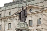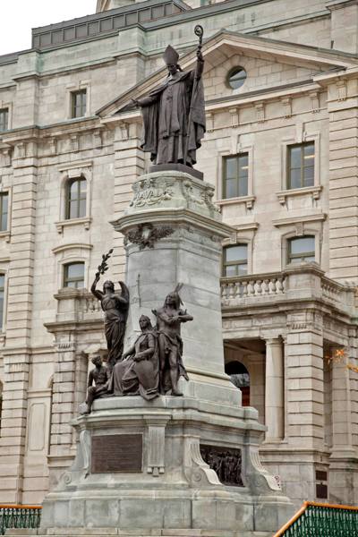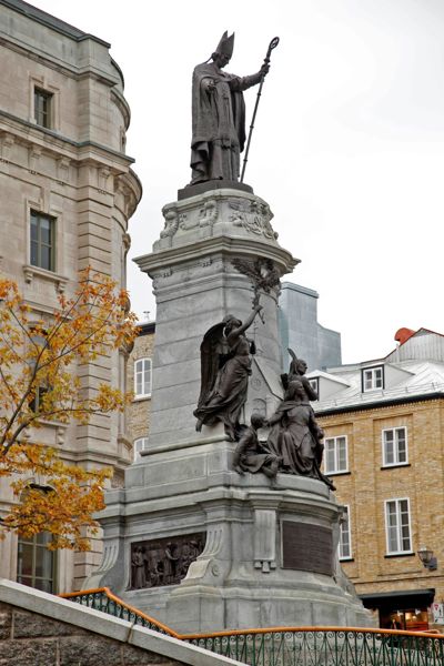 La statue de Mgr François de Montmorency-Laval, premier évêque de la Nouvelle-France et fondateur du Séminaire de Québec, domine le paysage. Coiffé de la mitre et revêtu de la chape épiscopale, le prélat ouvre les bras dans une attitude d’accueil. Contre le fût s’appuie une allégorie de la Religion entourée d’un Amérindien, d’un collégien et d’un ange personnifiant la Gloire.