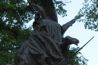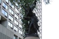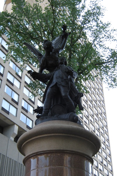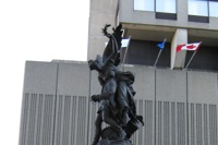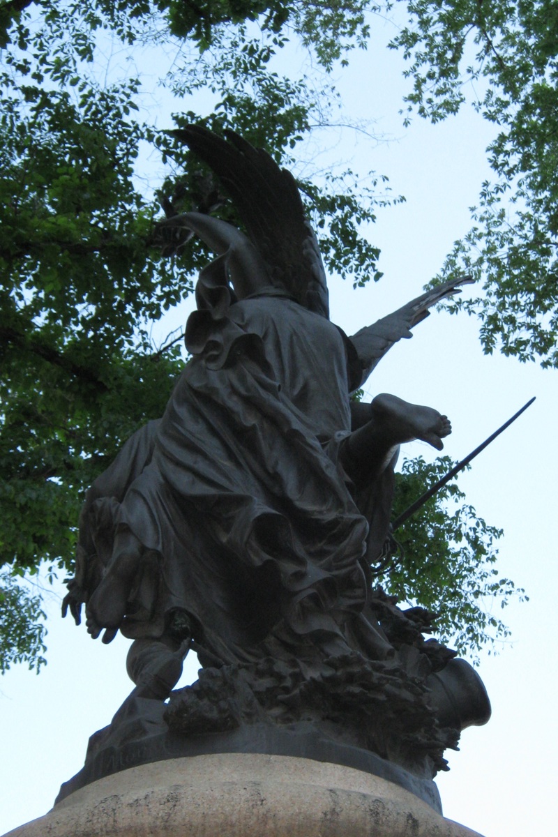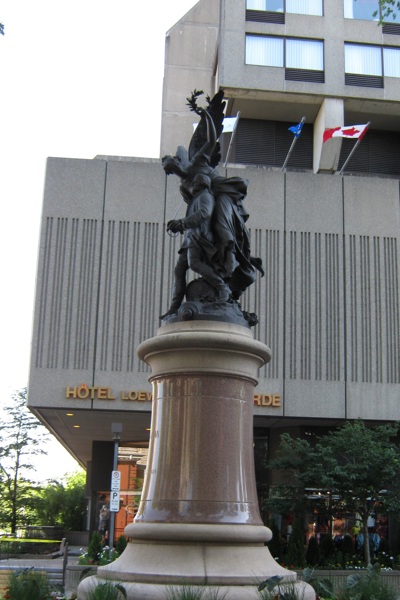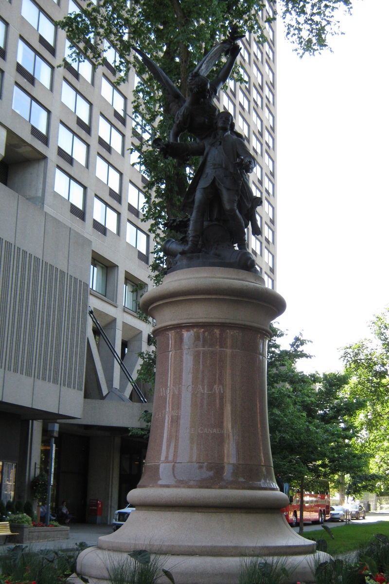 En 1759, Louis-Joseph de Saint-Véran, marquis de Montcalm, commande les troupes françaises lors de la bataille des Plaines d’Abraham, où il trouvera la mort. Le sculpteur l’a représenté blessé sur le champ de bataille, l’épée encore à la main, un canon à ses pieds. Il est soutenu par une figure ailée, la Renommée, qui s’apprête à le couronner de laurier, gage de son héroïsme.