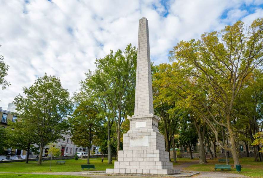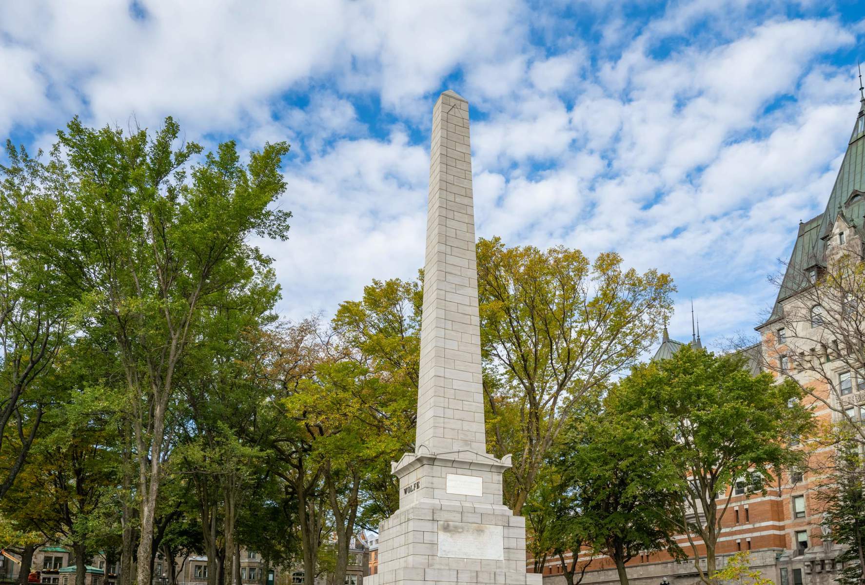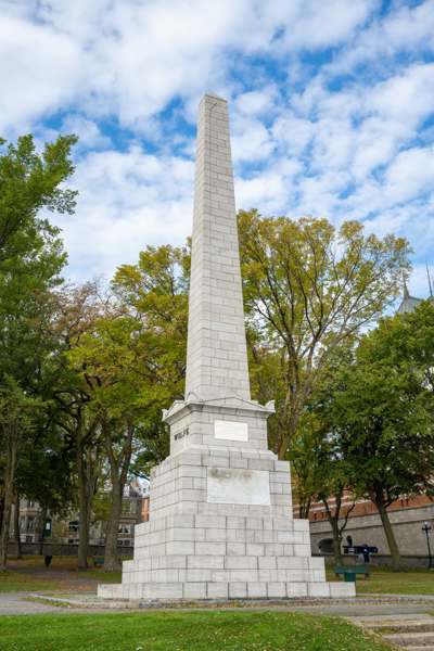 Une colonne surmontée d’un casque et d’une épée à l’antique se dresse à l’endroit où aurait péri le général britannique James Wolfe lors de la bataille des Plaines d’Abraham, le 13 septembre 1759. Il s’agit d’une réplique du monument de 1913 qui avait été détruit en 1963 par des partisans du Front de libération du Québec.