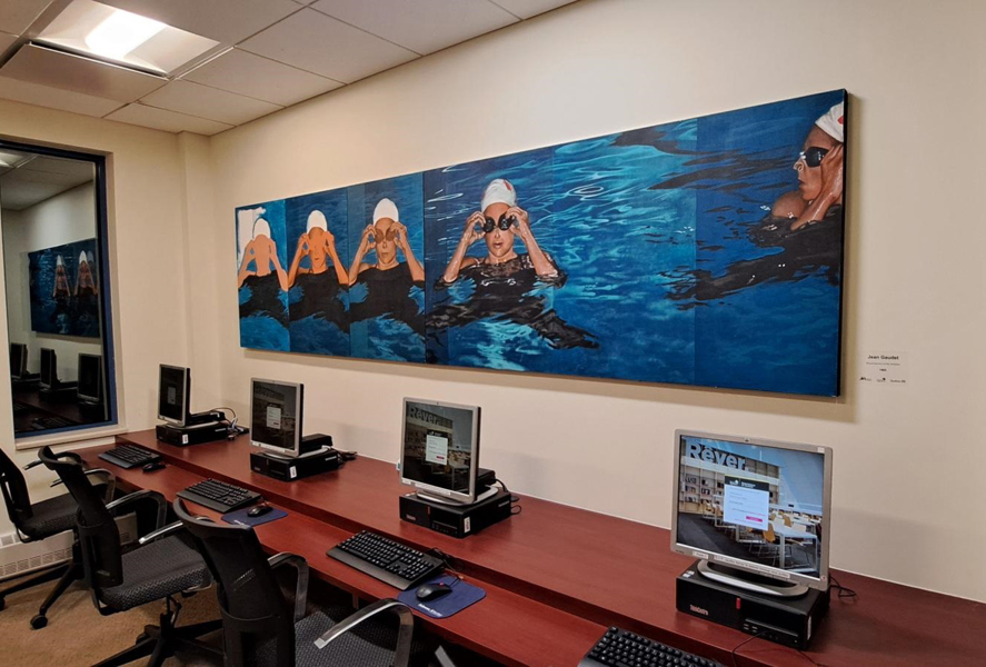 L’œuvre présente une nageuse qui ajuste ses lunettes protectrices pour mieux voir le public qui l’observe, public qui se trouve surpris d’être observé en retour. La peinture offre ainsi un jeu de croisements de regards en mettant face à face des protagonistes qui s’adonnent à une activité de détente (la nage et la lecture).