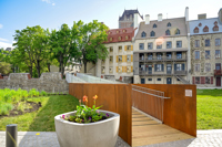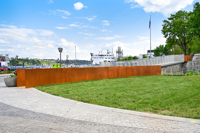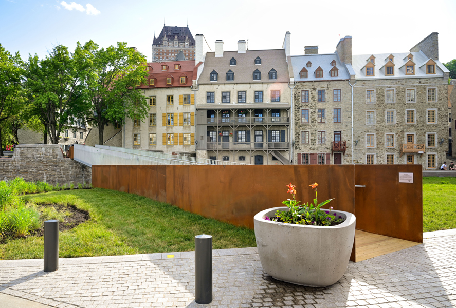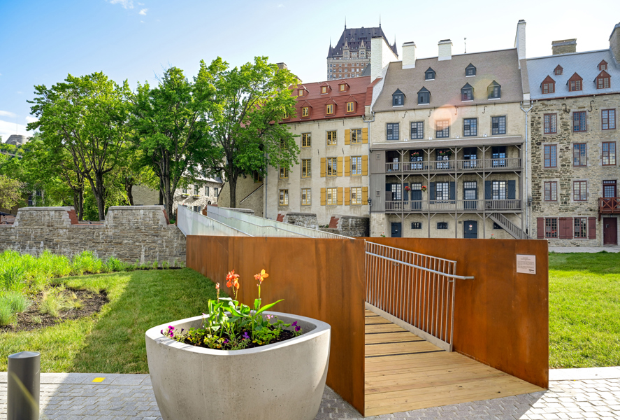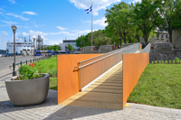 Cette œuvre d’art sculpturale qui relie la place de Paris à la batterie Royale offre une expérience inédite aux passants. Conçue en porte-à-faux, elle s’élance au-dessus de la douve, sans jamais toucher à la section située sur la fortification. Une brèche s’ouvre sur le vide, rappelant la rampe d’un bateau qui s’apprête à accoster.