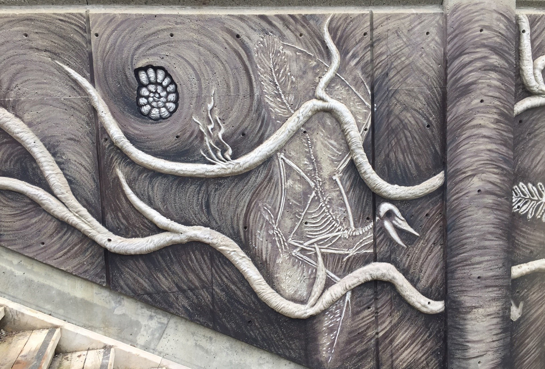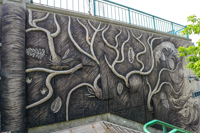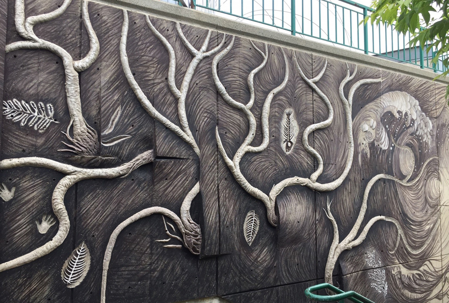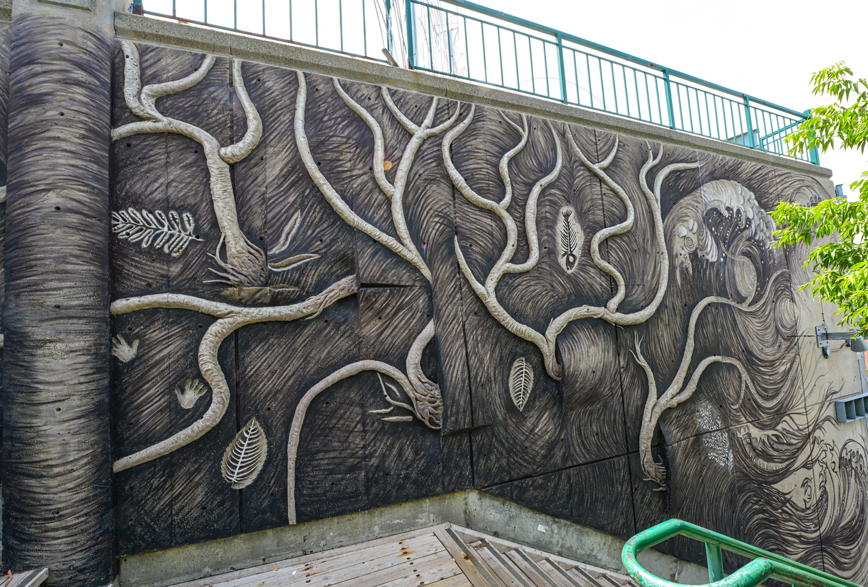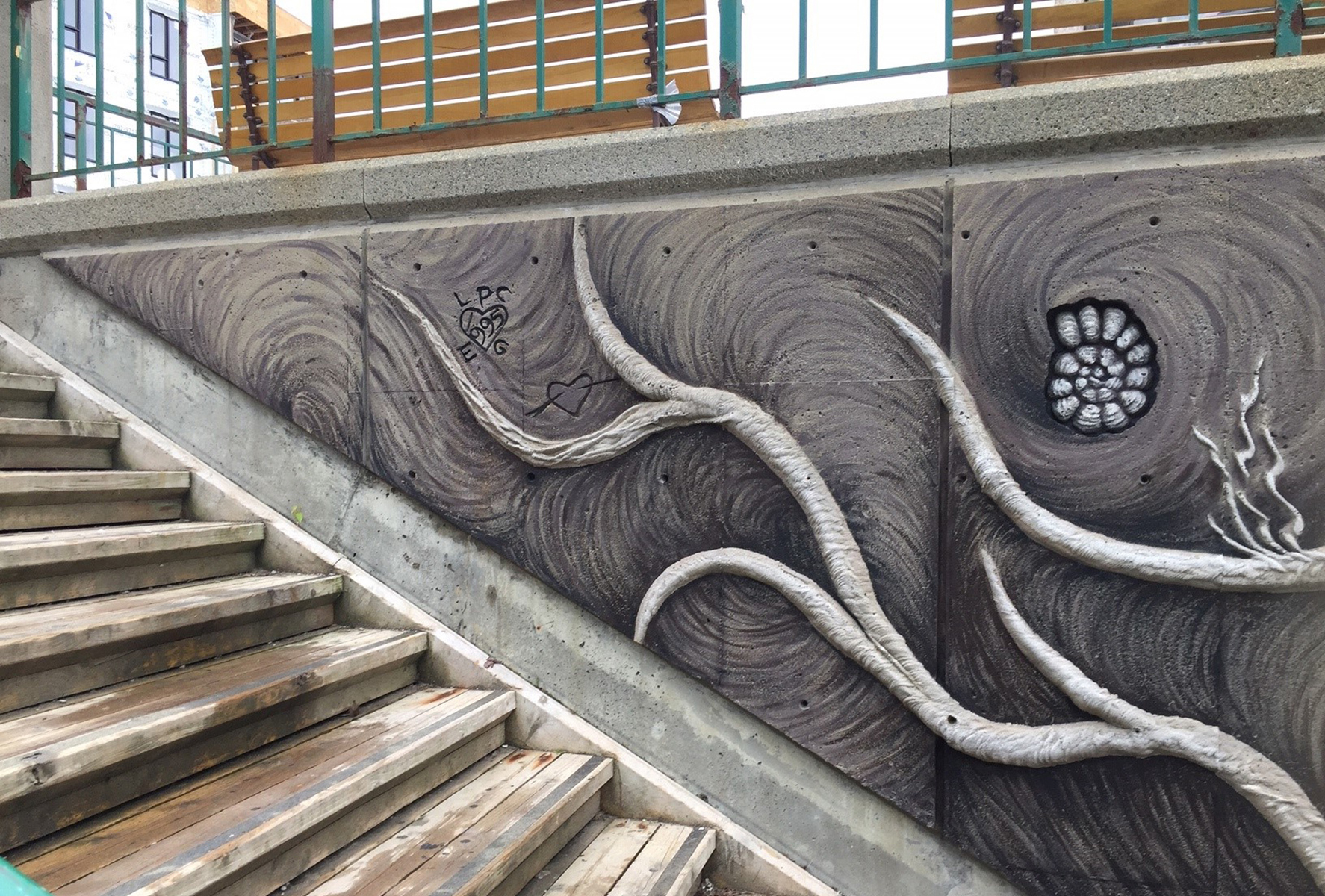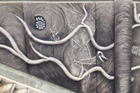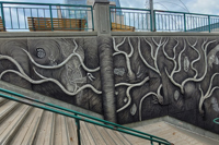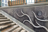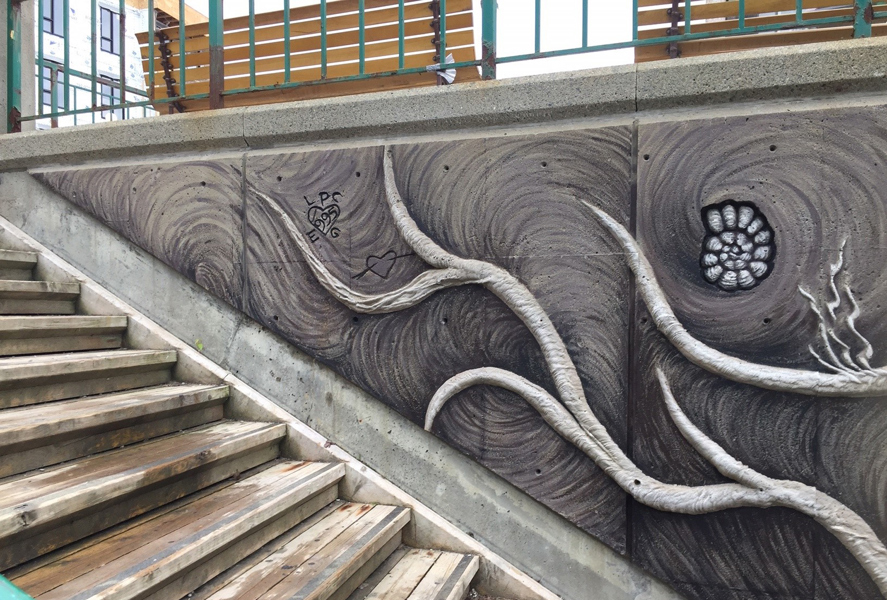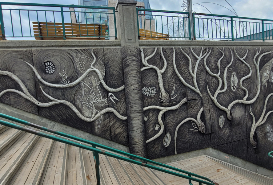 En empruntant l’escalier qui relie la côte d’Abraham au quartier Saint-Roch, on longe un sous-sol terreux dressé à la verticale et parsemé de racines et de fossiles. Sur un mur de béton, des formes en relief dessinent une ornementation rappelant les cheveux de Méduse, divinité dont le nom est aussi celui de la coopérative artistique voisine.