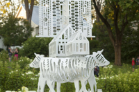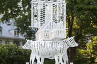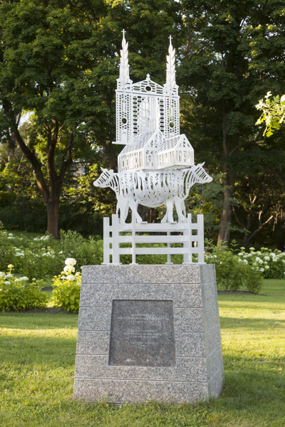 Cette sculpture réunit des éléments particuliers du patrimoine bâti, religieux et humain de Charlesbourg, désigné site patrimonial en 1964. Les éléments figuratifs sont empilés comme un totem créant une figure hybride à la fois symbolique et mythique.