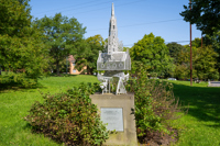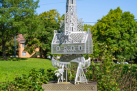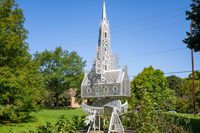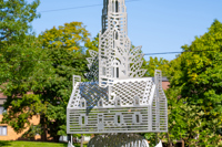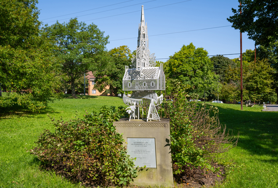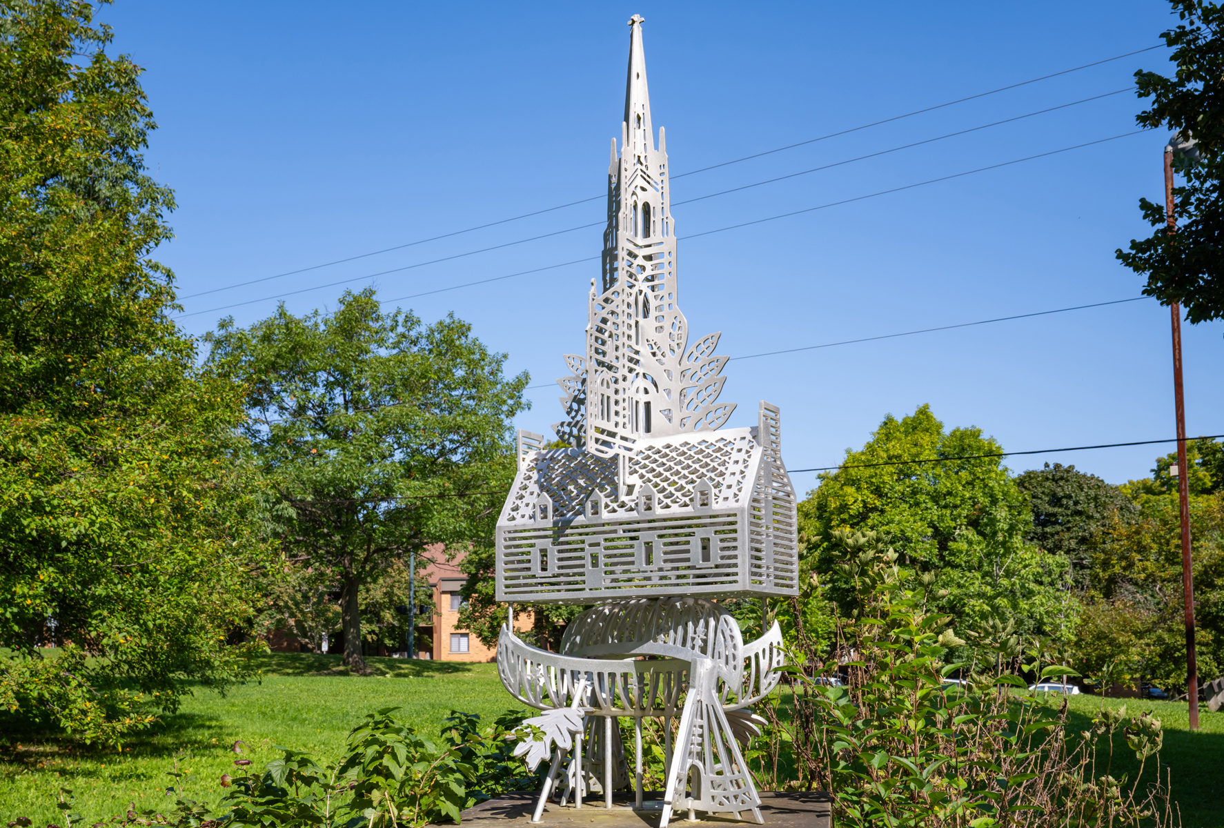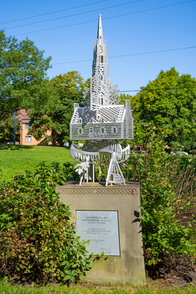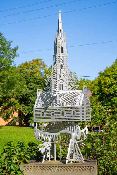 Cette sculpture réunit des éléments particuliers du patrimoine bâti, religieux et humain de Sillery, désigné site patrimonial en 1964. Les éléments figuratifs sont empilés comme un totem créant une figure hybride à la fois symbolique et mythique.