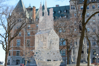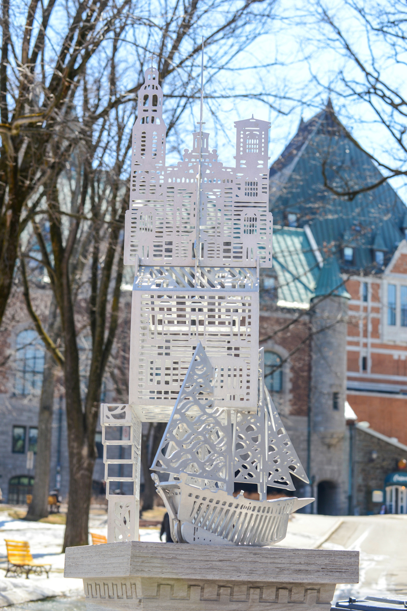 Cette sculpture réunit en une sorte de totem des éléments particuliers du patrimoine bâti, religieux et humain du Vieux-Québec, désigné site patrimonial en 1963. Les éléments figuratifs sont empilés comme un totem créant une figure hybride à la fois symbolique et mythique.