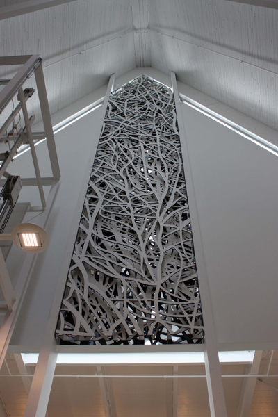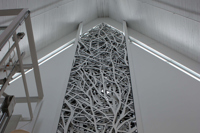 Cette œuvre de Claudie Gagnon foisonne de symboles. Les formes entrelacées telles des branches d’arbres évoquent les liens, les réseaux d’échange et la transmission des savoirs que favorisent les nouvelles technologies. Elles figurent aussi la forêt et sa part de mystère, espace magique et lieu de toutes les aventures dans la littérature jeunesse. Le bois, choisi comme matériau principal, participe à l’intégration de l’œuvre à l’architecture du bâtiment. Il fait en même temps le lien avec le livre : le bois de la forêt fournit le papier sur lequel les mots prendront forme pour donner naissance au livre.