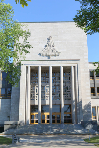 La sculpture représente, au centre, Saint Matthieu, patron chrétien des administrateurs: percepteurs, banquiers, changeurs et comptables. Saint Matthieu était un publicain (percepteur des impôts) employé au péage d'Hérode situé dans la ville de Capharnaüm en Galilée.