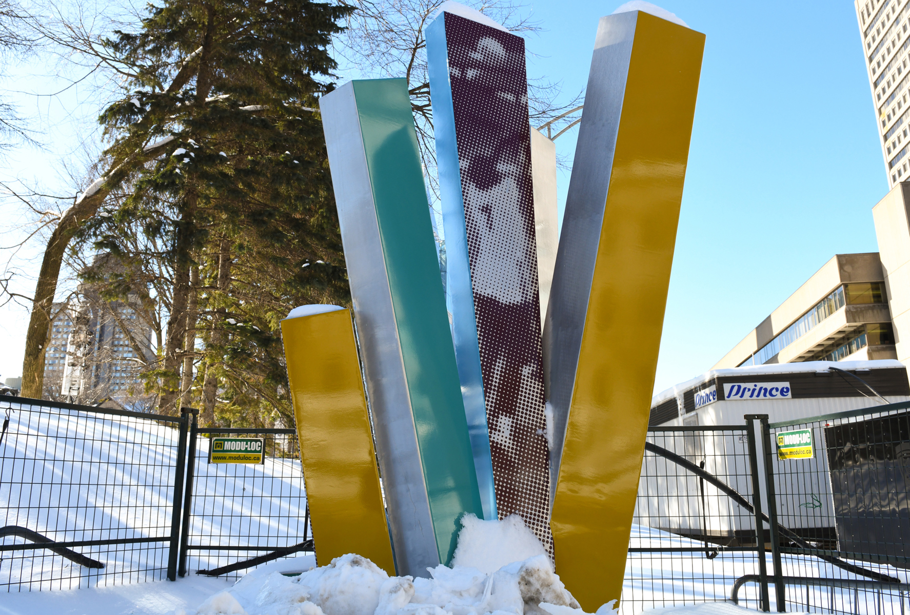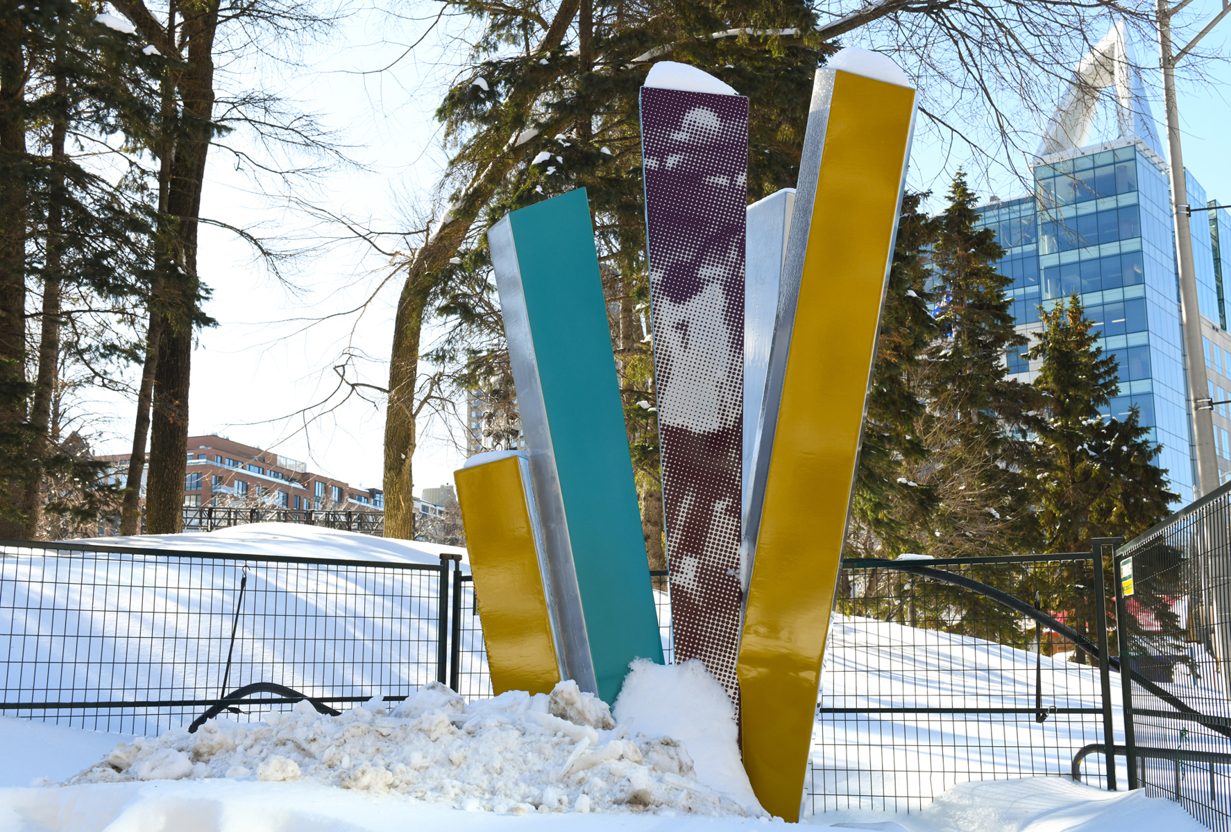Ce bouquet de colonnes entrecroisées témoigne de la fougue de la Superfrancofête, ce festival international qui ravit Québec en août 1974. La forme explosive et colorée traduit l’énergie du rendez-vous, fréquenté par un million de personnes. L’application mobile Québec 1974 propose divers documents d’archives pour revivre ces 11 jours hors du commun.